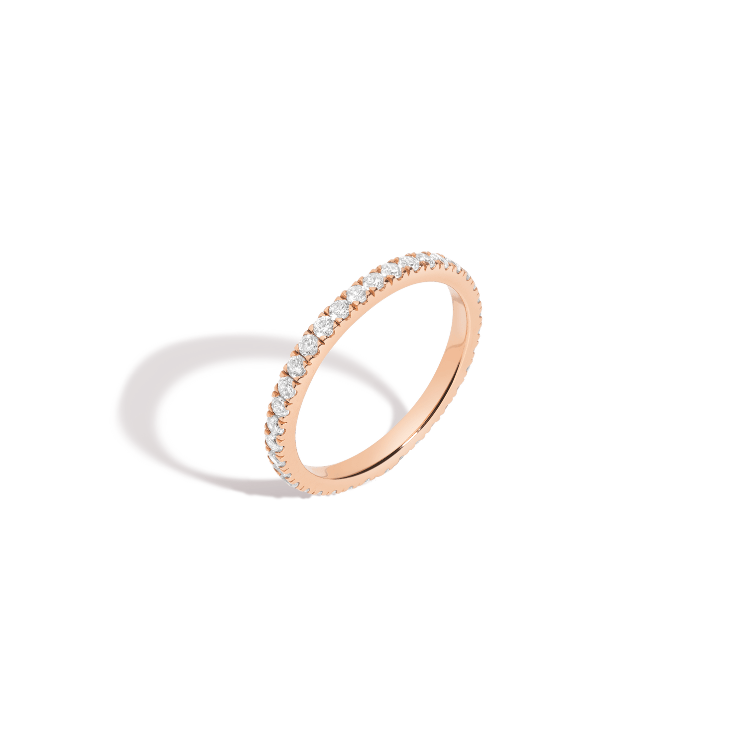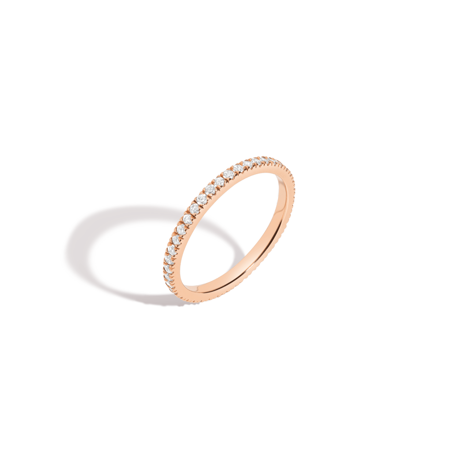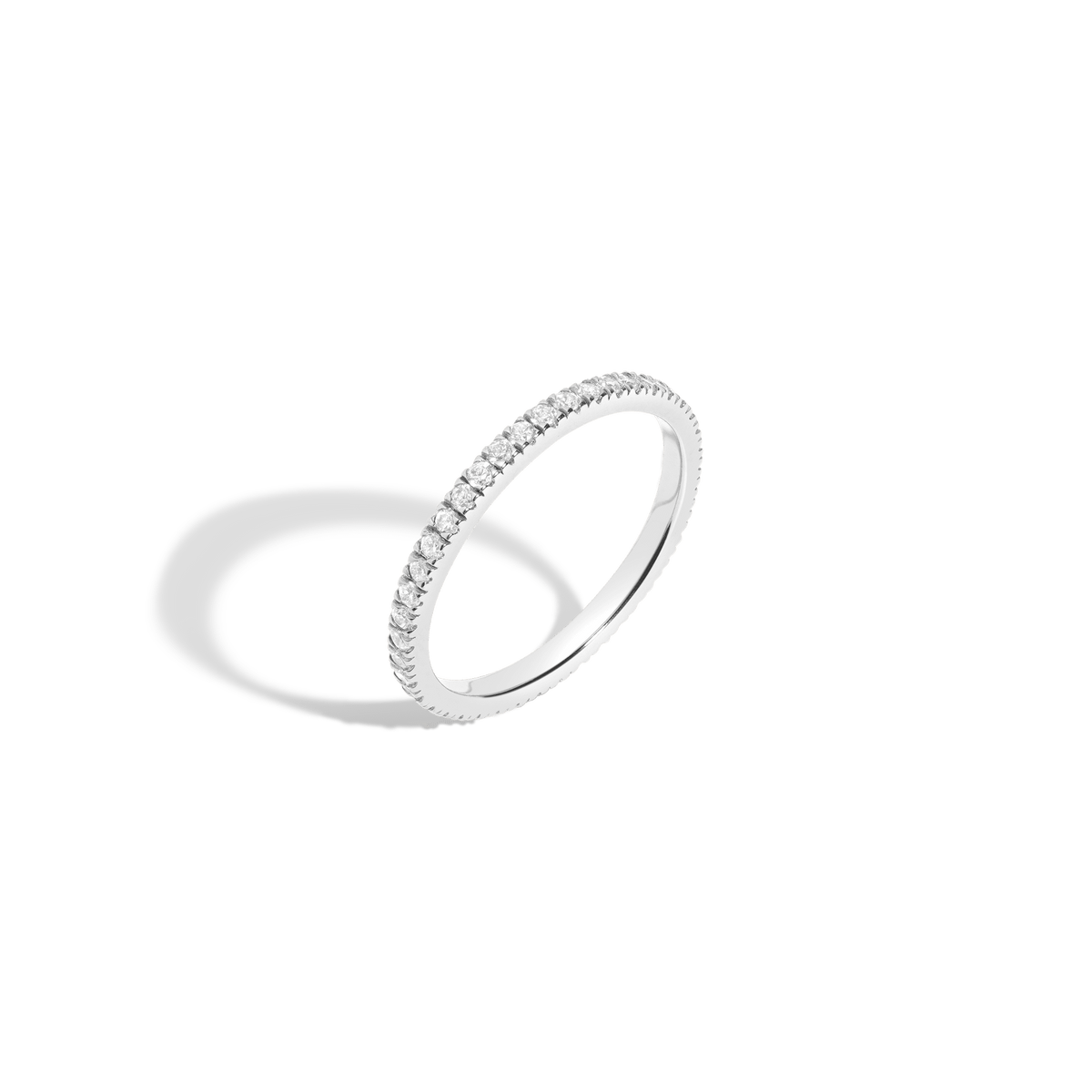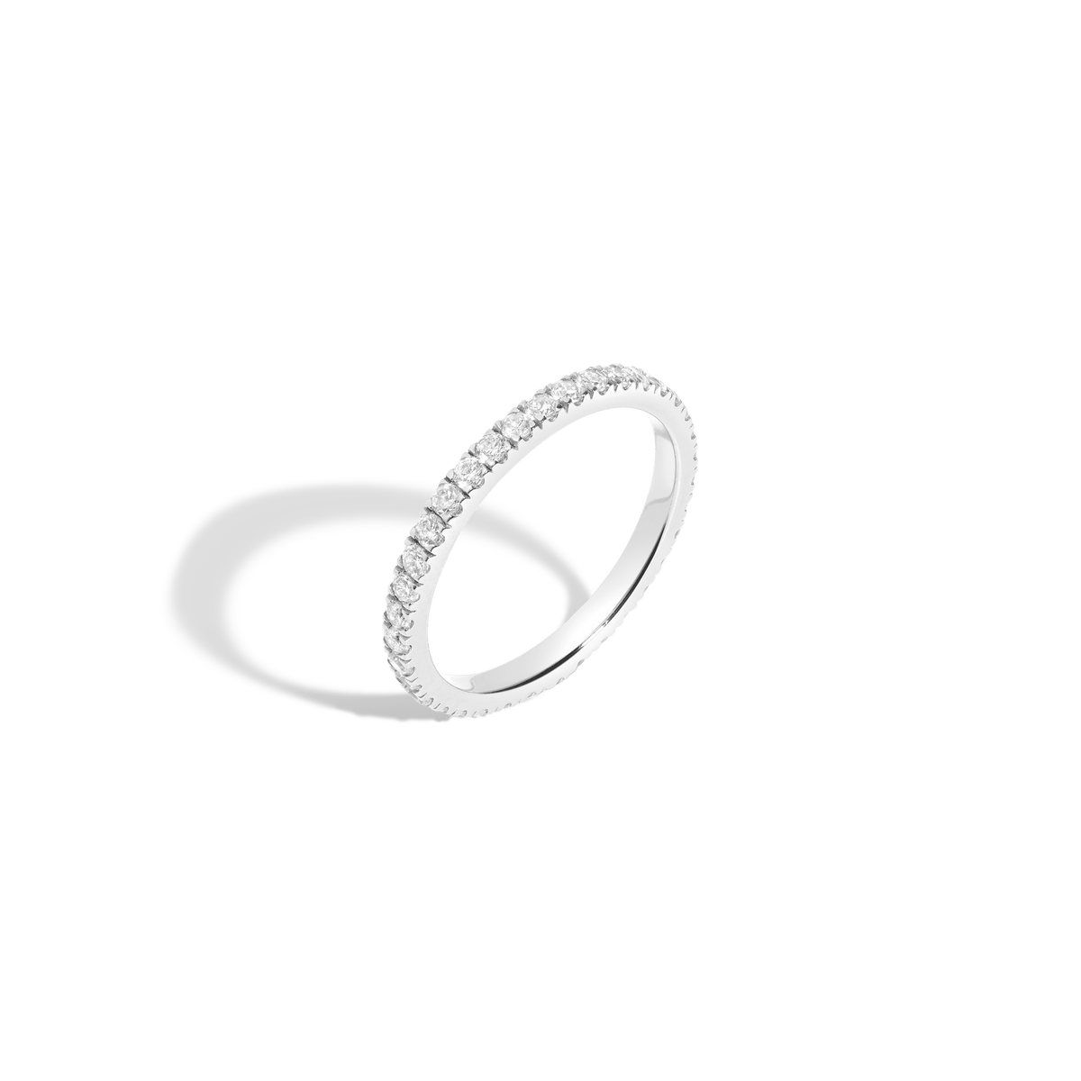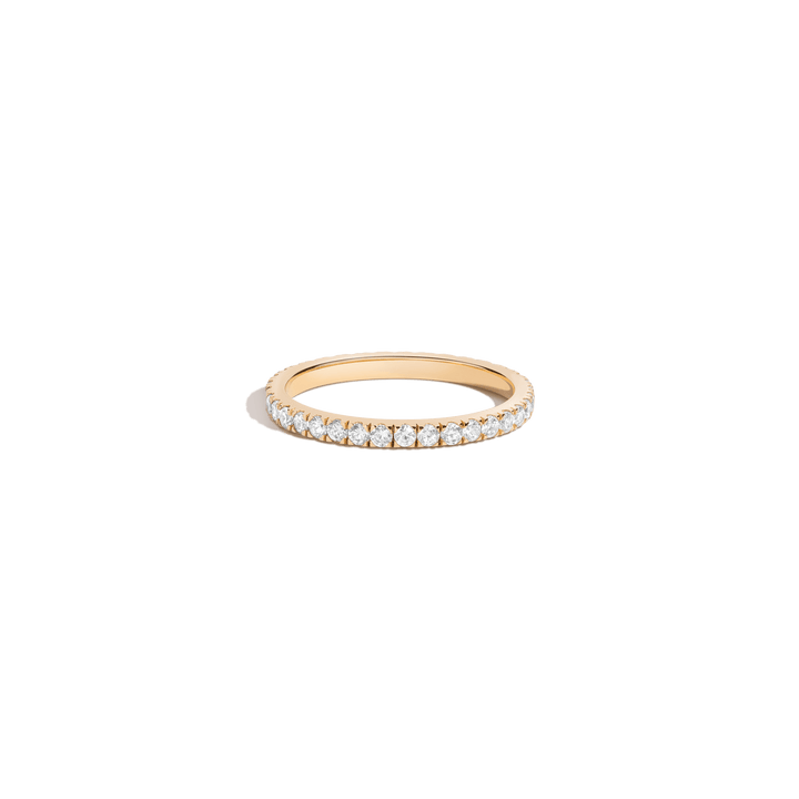 Crafted in 14k solid gold with GH/SI quality round lab-grown diamonds in French pavé setting. Available in: 0.125tcw (1.3mm width, 0.8mm stones), 0.25tcw (1.5mm, 0.9mm), 0.50tcw (2mm, 1.35mm), and 0.75tcw (2.4mm, 1.6mm). Thickness: 2mm. Weight: 2.2g.