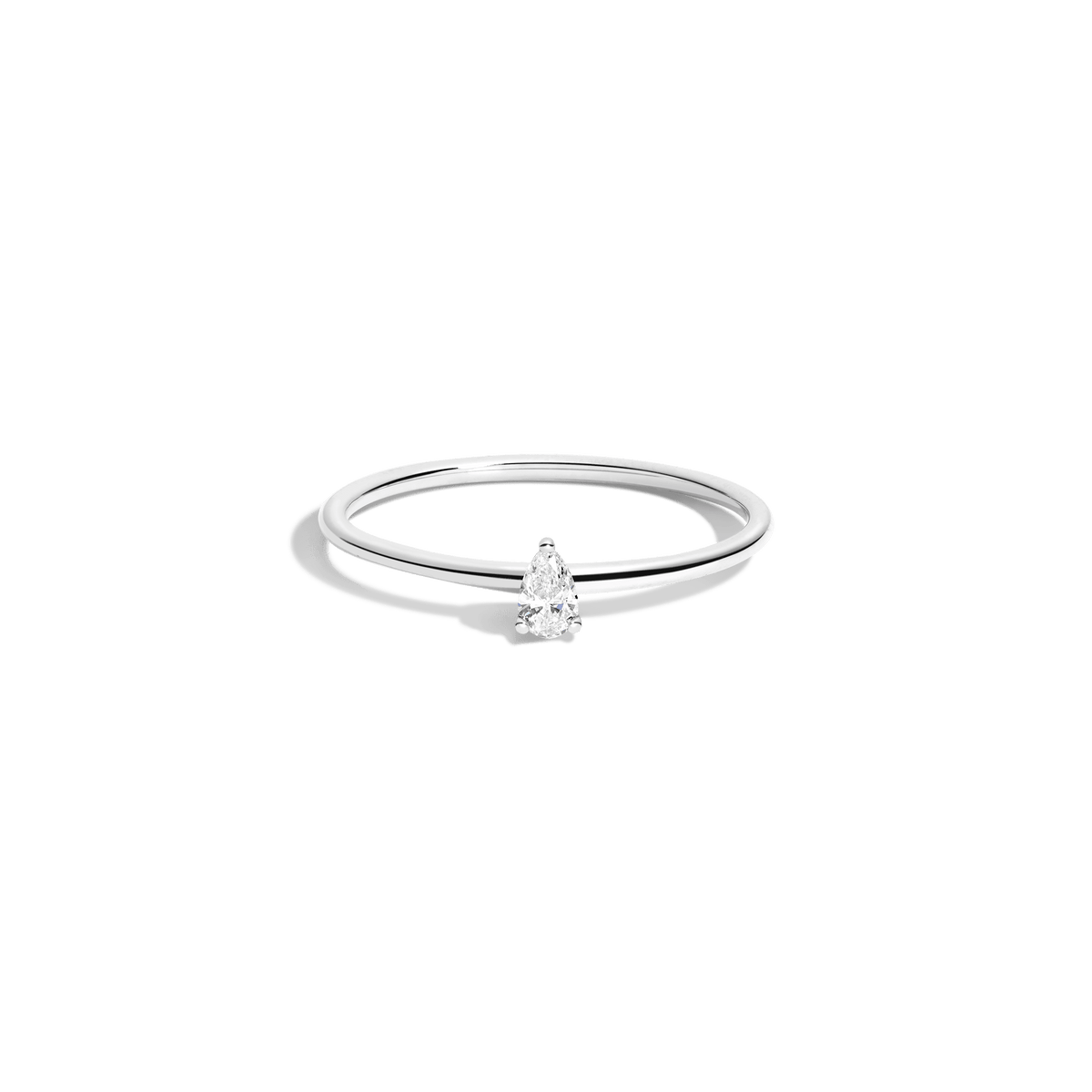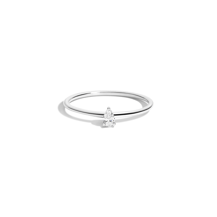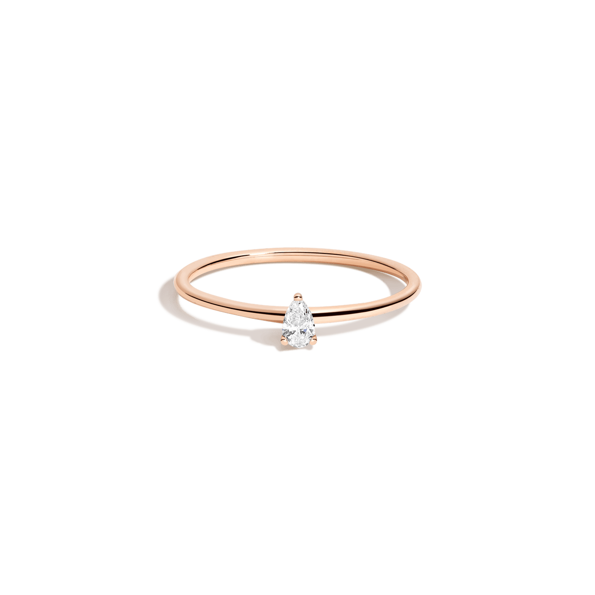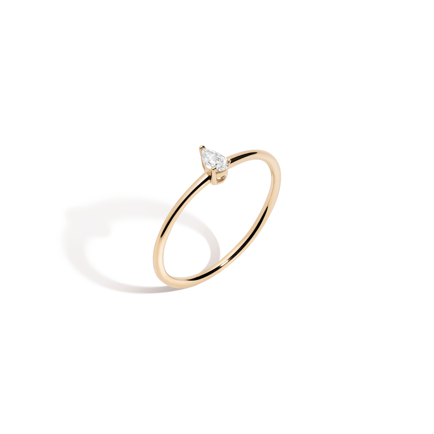 Handcrafted in 18k gold with a G SI1 pear lab grown diamond (4x2mm, 0.2ct), set in a 4-prong setting. Band width: 1.2mm, setting height: 4mm. Basket dimensions: 5x3mm. Weight: 0.7g.