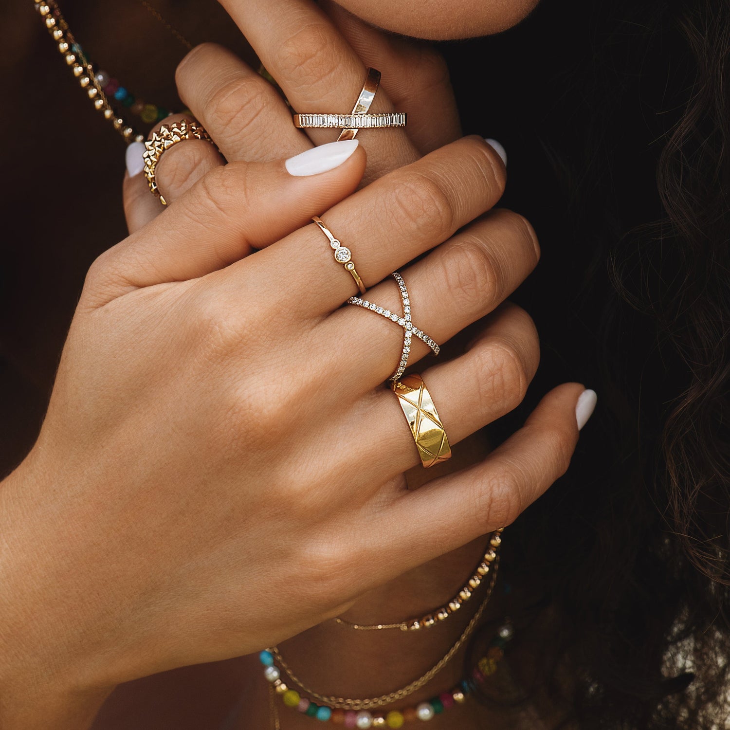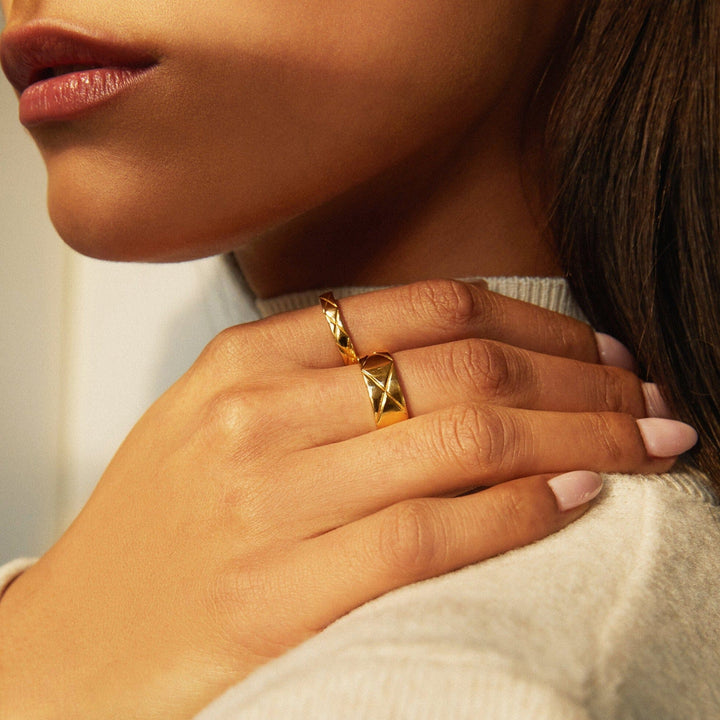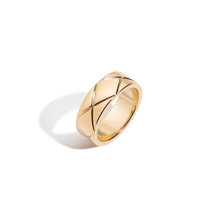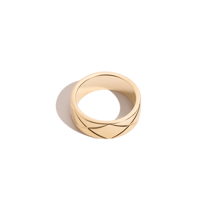 This Quilted Gold Ring by Aurate in Vermeil is an iconic statement piece. With its rich cross-hatch design and substantial feel, it combines the softness of a quilted pattern with the strength of sculptural gold. Perfect for adding texture to a stack or wearing solo.