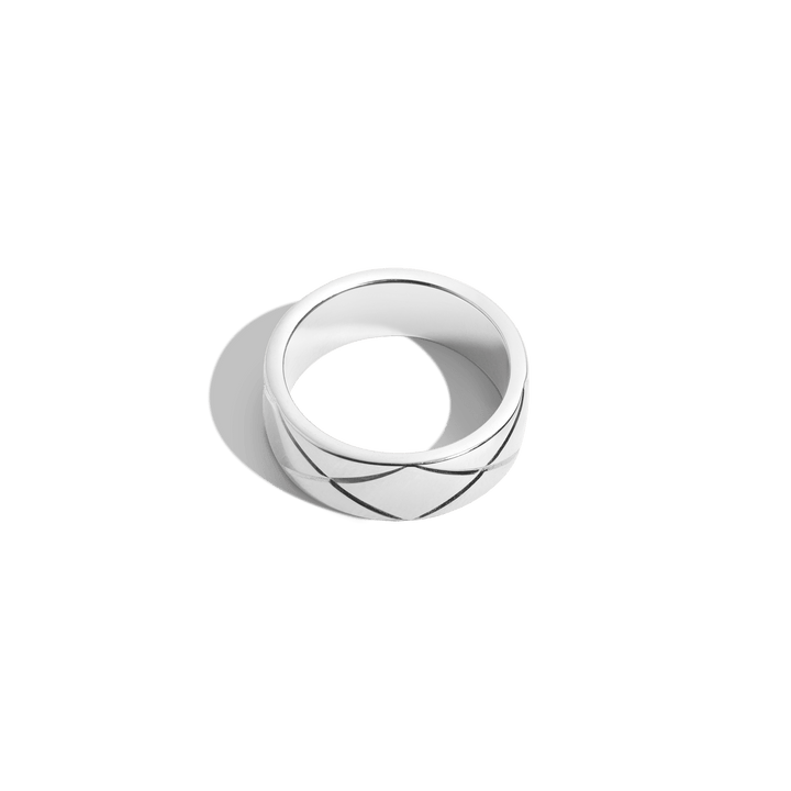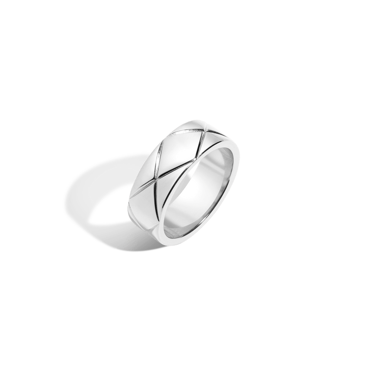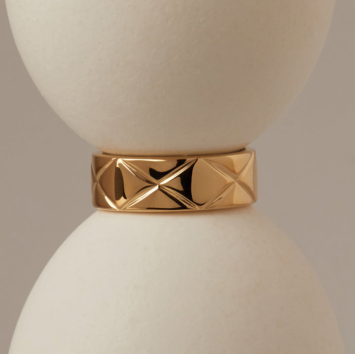Handcrafted in vermeil with a flat quilted X-pattern. 6.5mm wide, 2mm thick, and weighs 7g.
