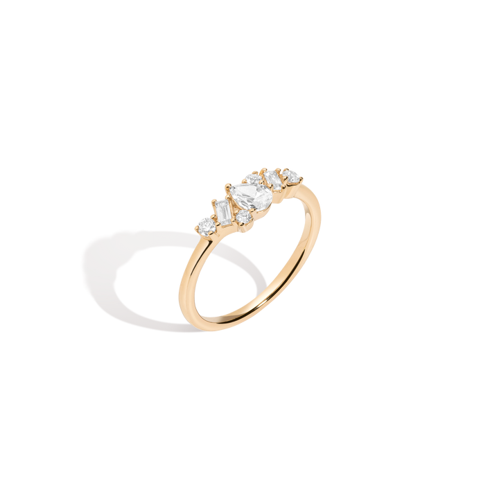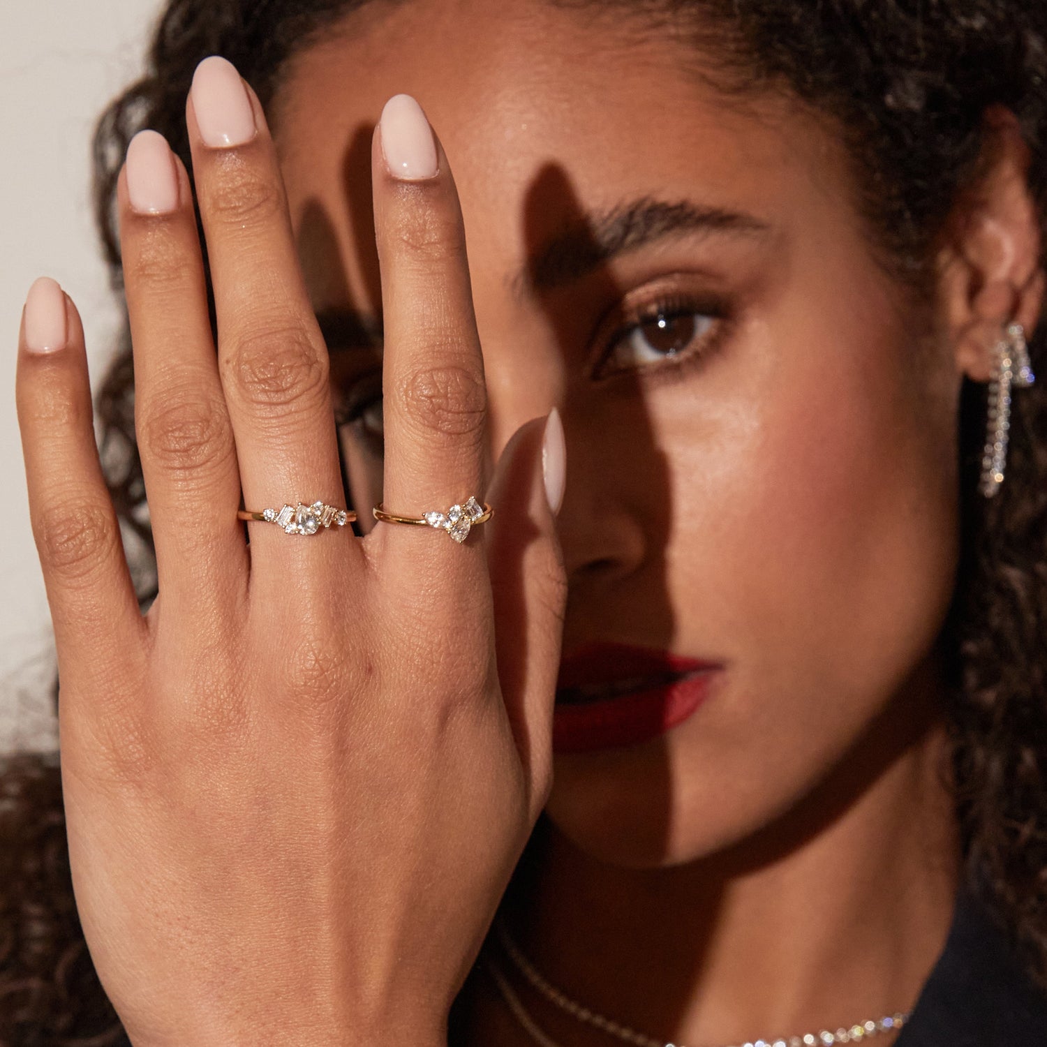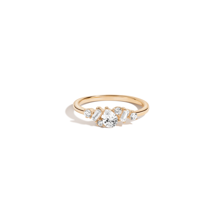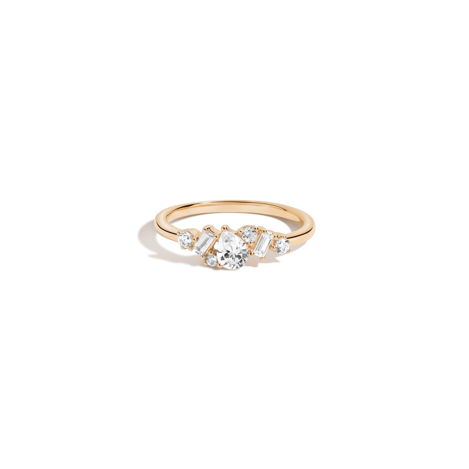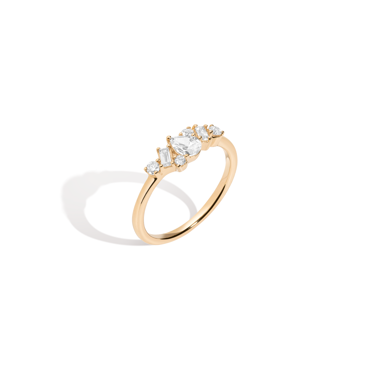 The Samantha by Aurate is a radiant cluster ring featuring a striking mix of diamond cuts. Designed in 14k gold, this piece balances modern form with romantic detail. A captivating blend of round, pear, and baguette lab grown diamonds creates a brilliant constellation of elegance.