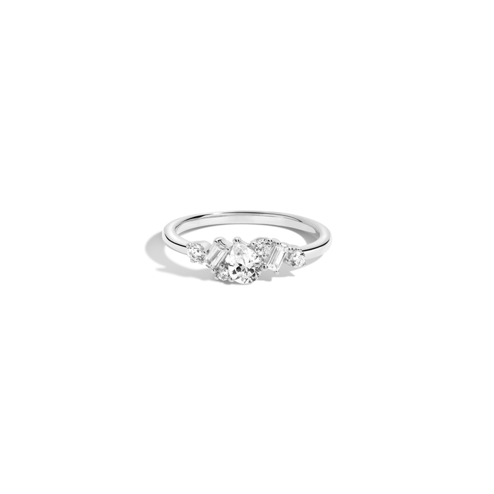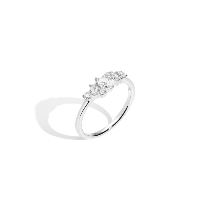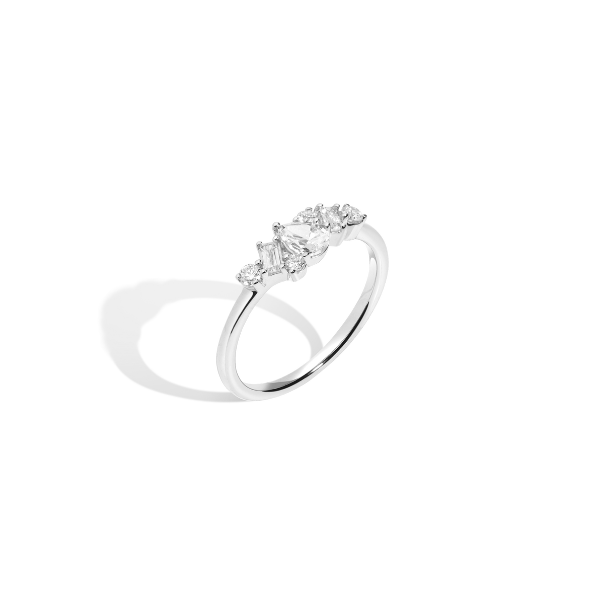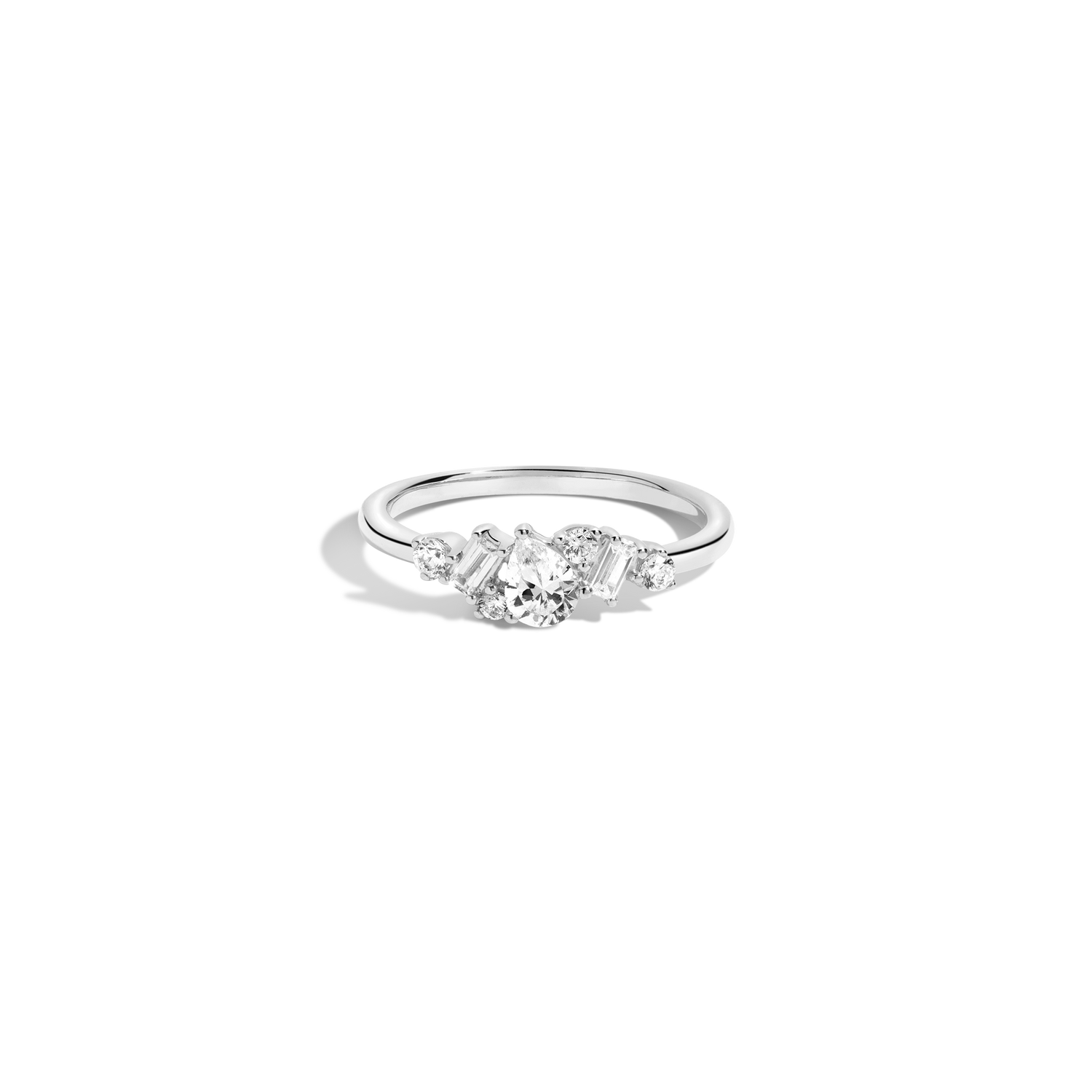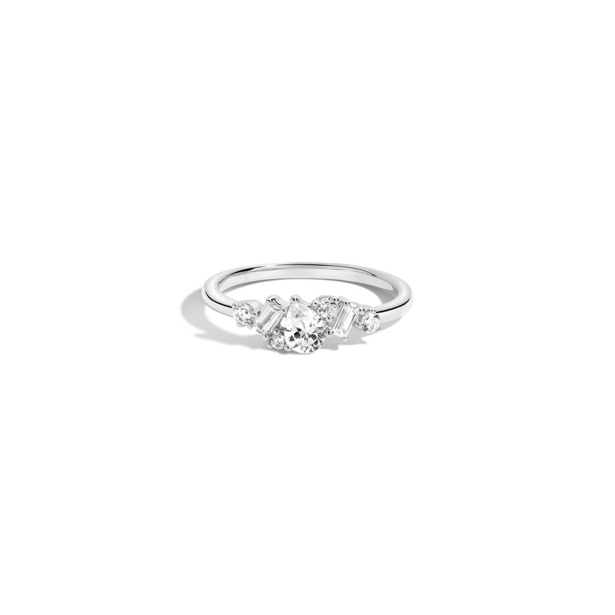 The Samantha by Aurate is a radiant cluster ring featuring a striking mix of diamond cuts. Designed in 14k gold, this piece balances modern form with romantic detail. A captivating blend of round, pear, and baguette lab grown diamonds creates a brilliant constellation of elegance.
