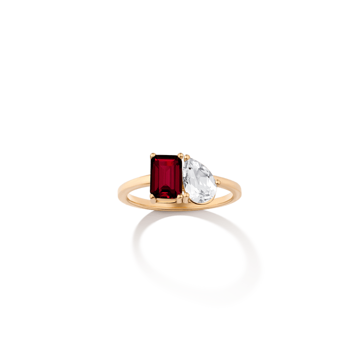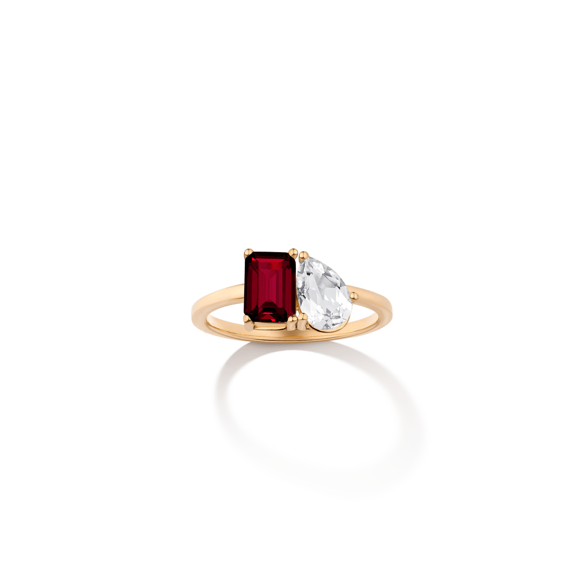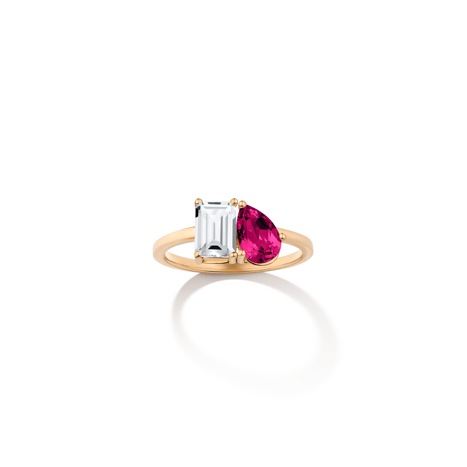 Crafted in gold vermeil with an 8x5mm pear-cut gemstone (1ct) and a 7x5mm emerald-cut gemstone (1ct). Band width: 1.75mm, thickness: 1.5mm, weight: 1.5g. Combines lab-grown and natural gemstones.