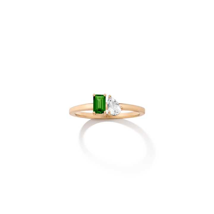 Crafted in gold vermeil with 5x3mm pear and 5x3mm emerald-cut gemstones (0.29ct each). Band width: 1.75mm, thickness: 1.5mm, weight: 1.3g. Features a blend of lab-grown and natural gemstones.