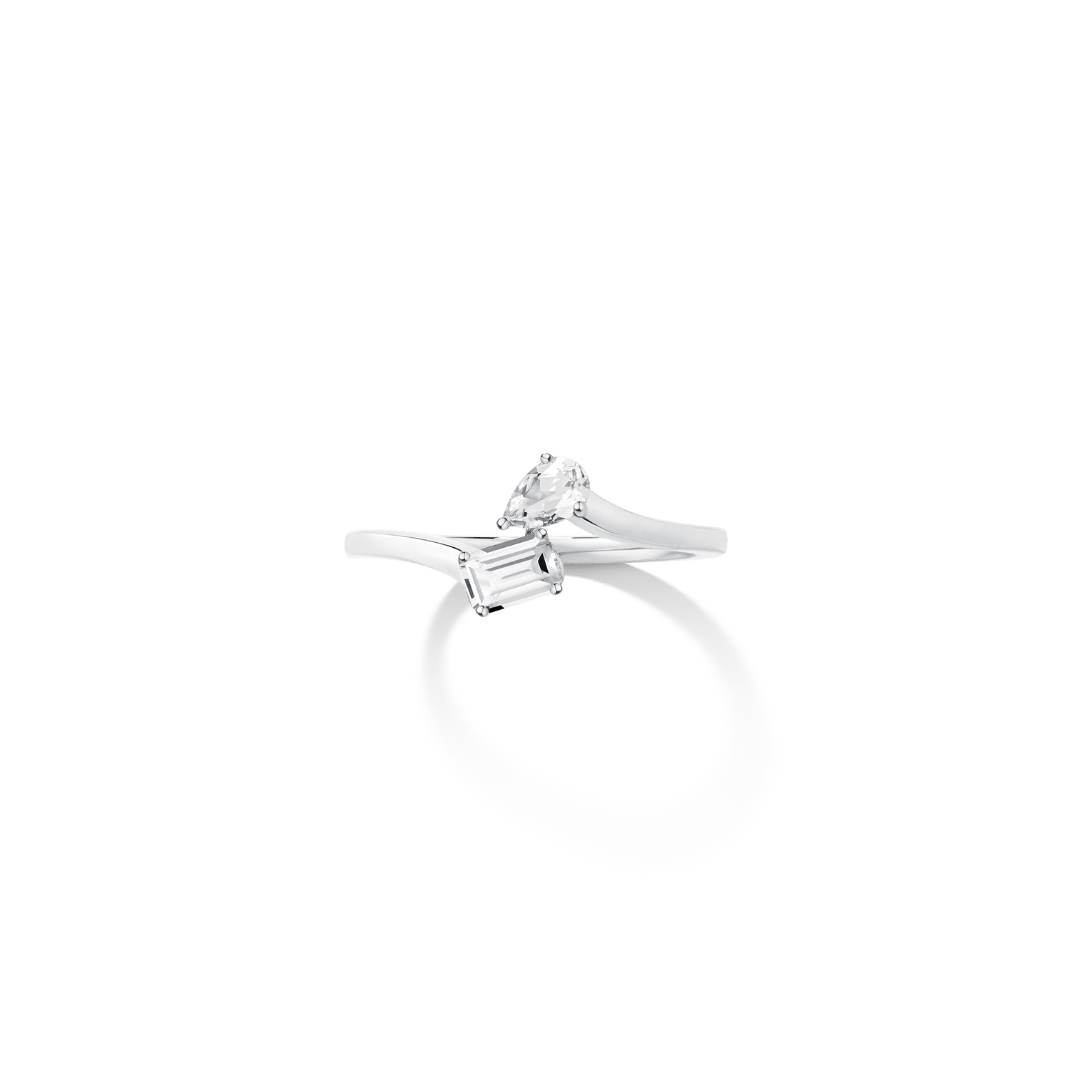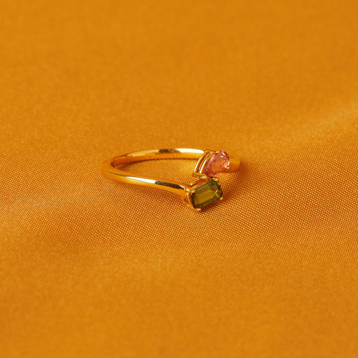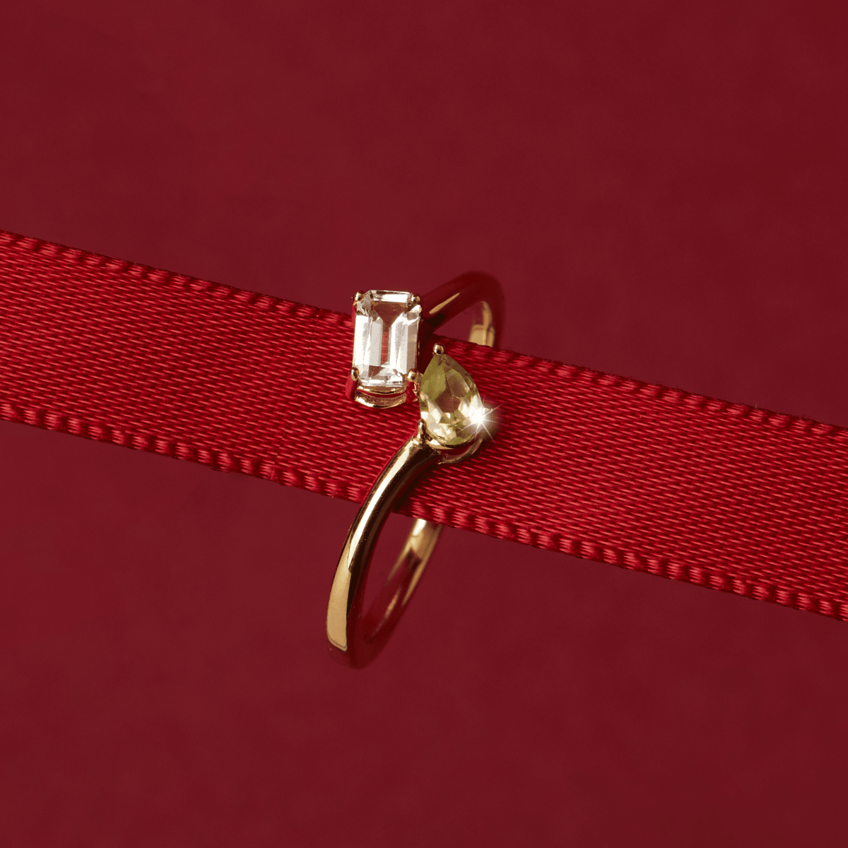 Crafted in gold vermeil with a 5x3mm pear-cut gemstone (0.29ct) and a 5x3mm emerald-cut gemstone (0.29ct). Band width: 1.75mm, thickness: 1.5mm, weight: 1.3g. Mix of lab-grown and natural gemstones.