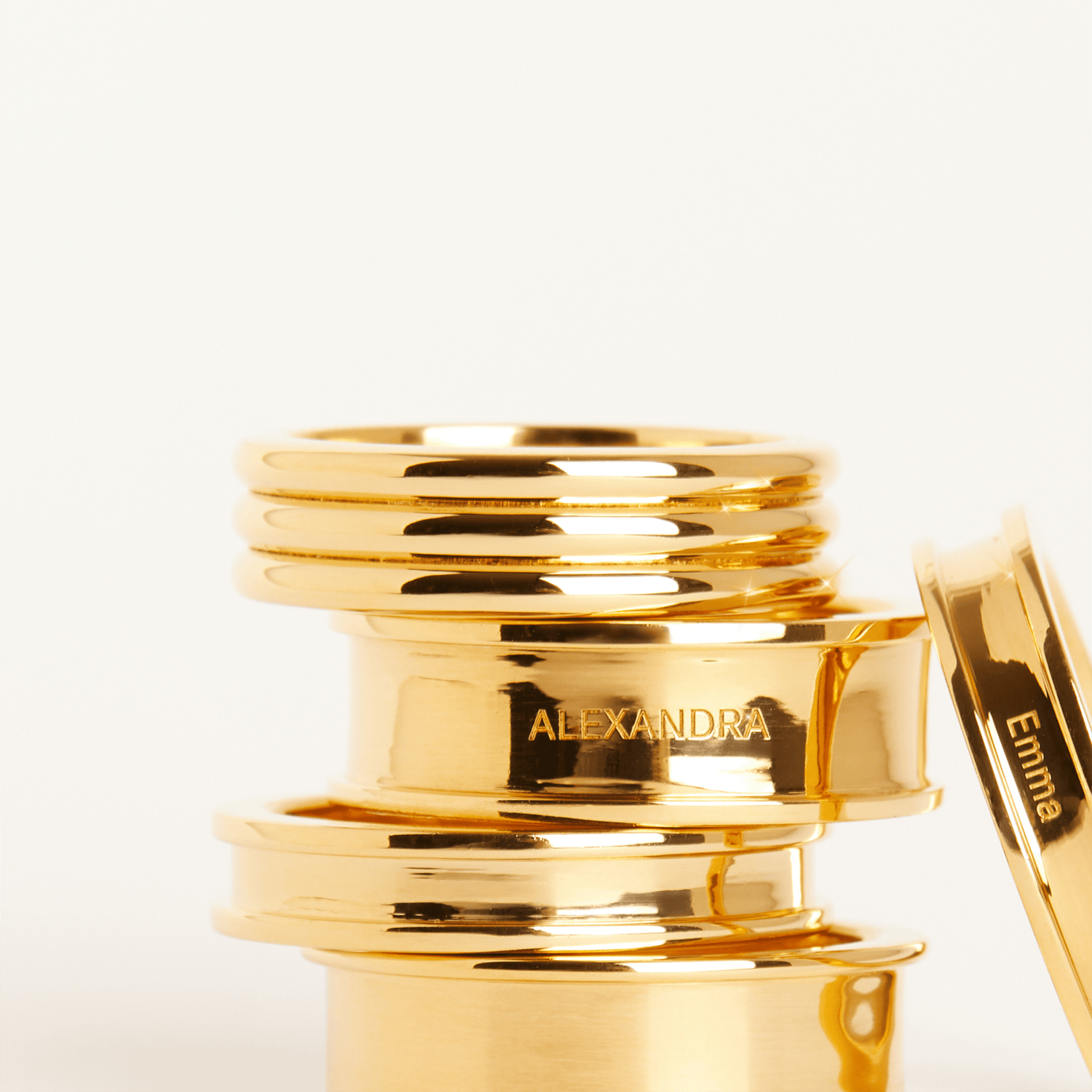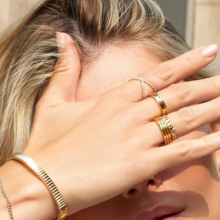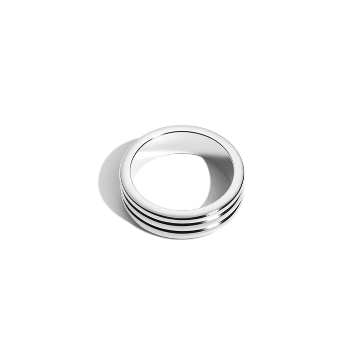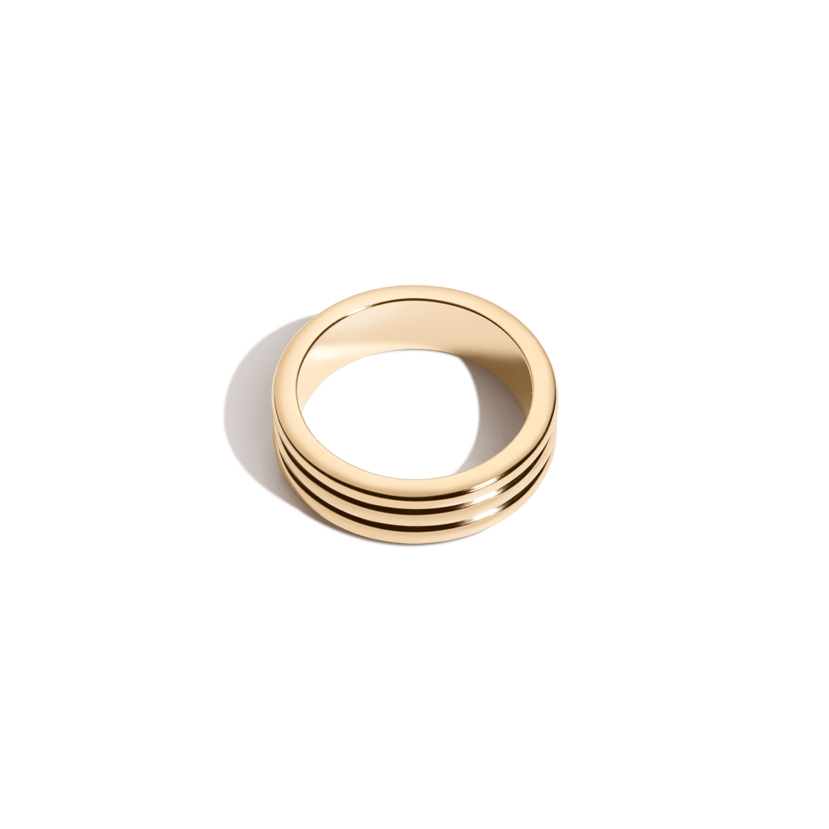 This Triple Row Ring by Aurate in 18k gold is bold, polished, and modern. With three smooth domed bands fused into one shining structure, it’s a striking piece that balances sculptural impact with sleek refinement.