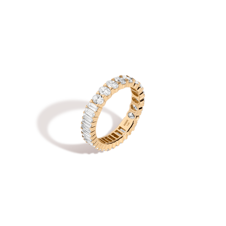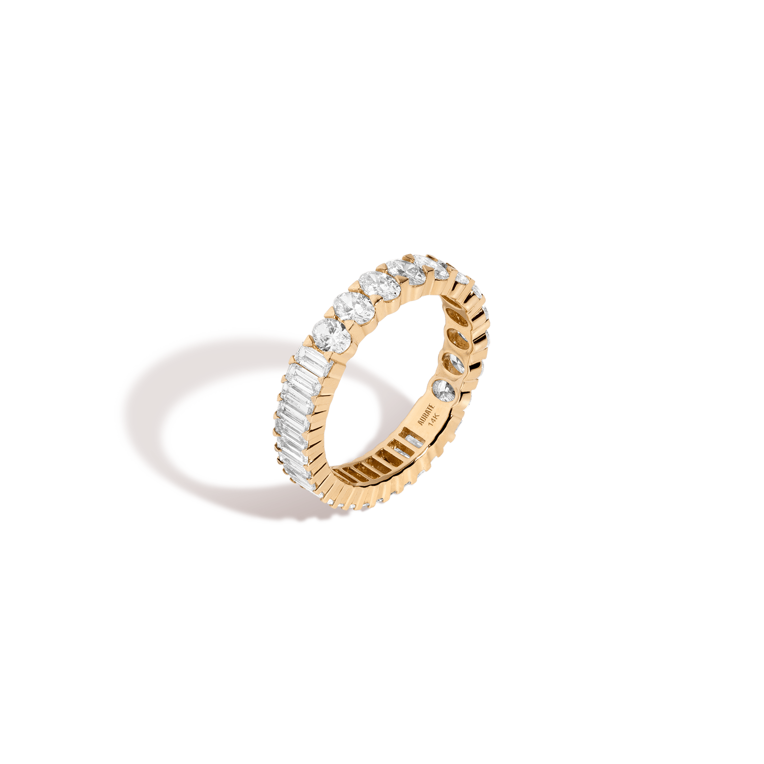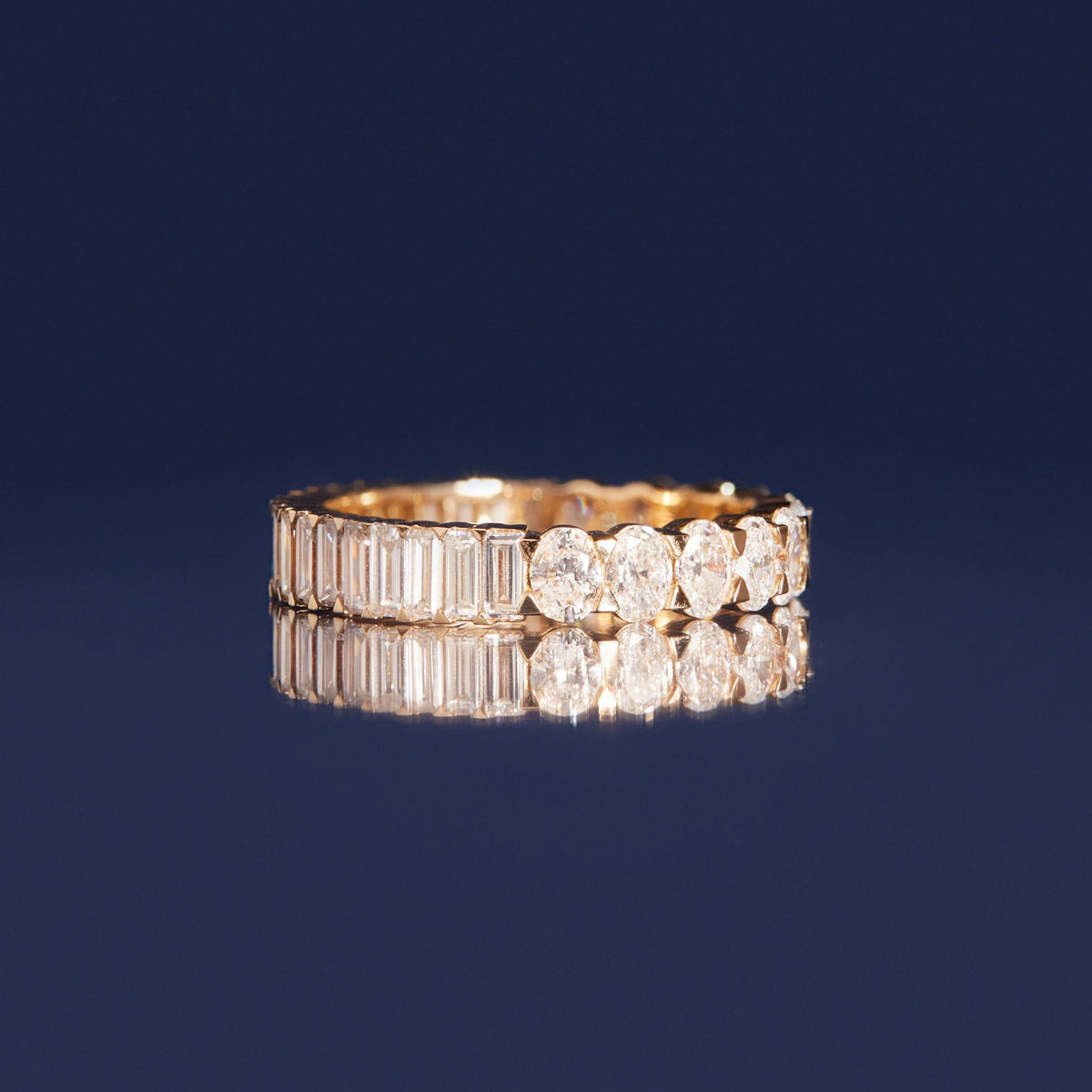 This Two-in-One Lab Grown Diamond Eternity Ring by Aurate in 18k gold seamlessly merges sharp geometry with organic curves. Half radiant baguette, half luminous oval cuts — it’s a sculptural stunner crafted in recycled gold. Dual design, singular statement.