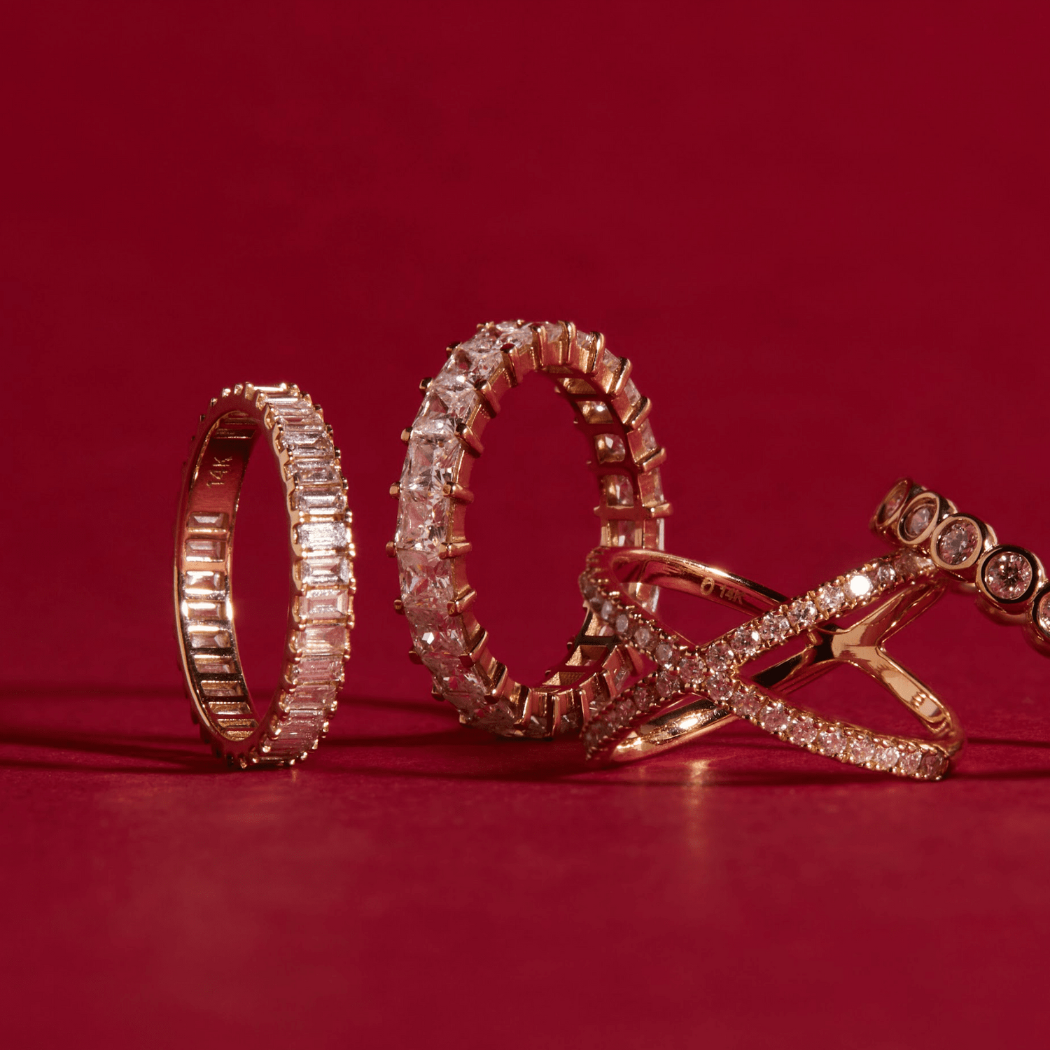 Handcrafted in 14k gold with 22 princess cut diamonds, each 3x3mm. Total carat weight: 4.4ct, SI clarity. Width and length: 22mm; thickness: 2.3mm; total weight: 2.6g.