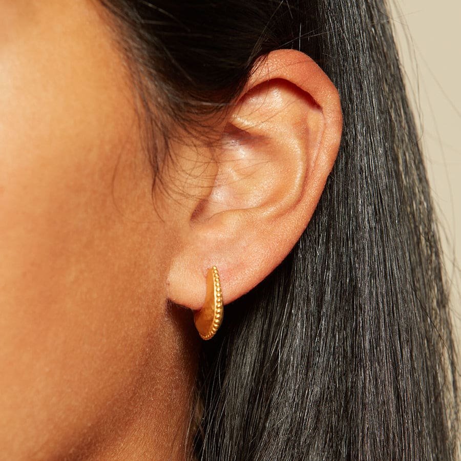 Satya Scainetti has been crafting inspiring jewelry designed for life's journey since 2002. Featuring sacred symbols and healing gemstones, each creation is infused with spiritual meaning to evoke empowerment and joy. Designed with intention in New York City, the jewelry is handcrafted with love in India, Thailand, and the USA, upholding the highest quality standards, ethical practices and social responsibility. Join the brand in supporting children through the Satya Foundation partnership.Style notes: Step boldly into your personal truth. Thick hammered 18kt gold plate or sterling silver hoop earrings create a bold profile as the beaded detail adds a timeless touch. Price: Please note price may vary due to exchange rate differences or shipping, duties and taxes. Price may also vary with materials choice. Final price is calculated at checkout at the designer's website. Materials: 18k gold plated brass. Also available in silver. Dimensions: Hoop size - 14 x 17mm.