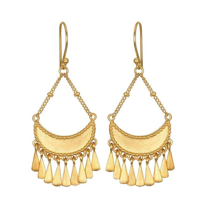 Satya Scainetti has been crafting inspiring jewelry designed for life's journey since 2002. Featuring sacred symbols and healing gemstones, each creation is infused with spiritual meaning to evoke empowerment and joy. Designed with intention in New York City, the jewelry is handcrafted with love in India, Thailand, and the USA, upholding the highest quality standards, ethical practices and social responsibility. Join the brand in supporting children through the Satya Foundation partnership.Style notes: The goddess moon nurtures us on our journey, protecting us from harm and illuminating our path to truth. Delicate 18kt gold plated chains anchor a crescent moon-symbol of the goddess, protection, and nourishment-and fluttering golden droplets for a timelessly elegant earring.Price: Please note price may vary due to exchange rate differences or shipping, duties and taxes. Price may also vary with materials choice. Final price is calculated at checkout at the designer's website. Materials: 18k gold plated brass. Dimensions: Pendant size - 18 x 21mm. Earring length - 44mm.