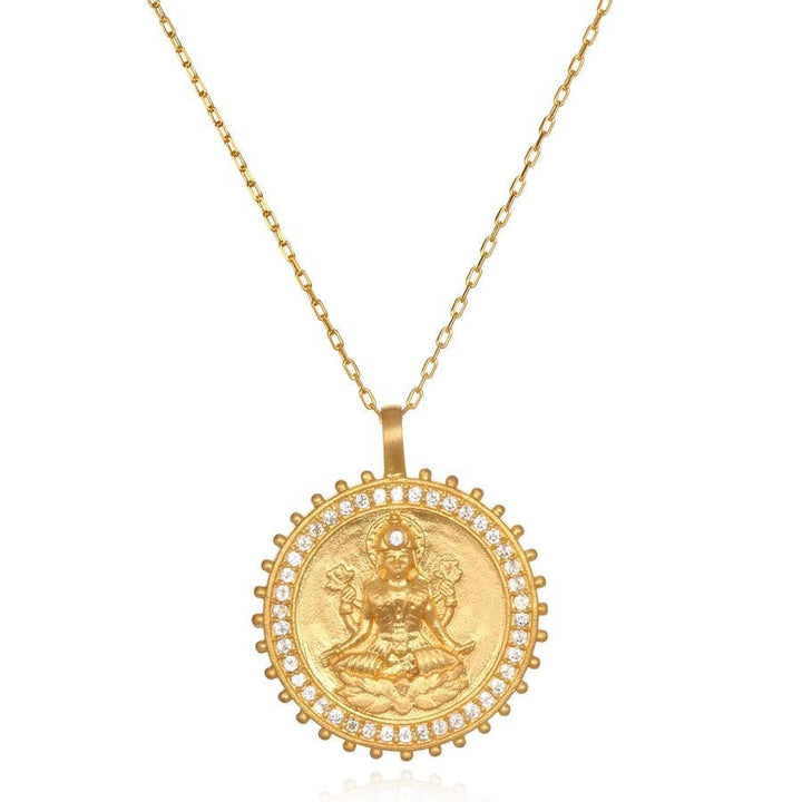 Satya Scainetti has been crafting inspiring jewelry designed for life's journey since 2002. Featuring sacred symbols and healing gemstones, each creation is infused with spiritual meaning to evoke empowerment and joy. Designed with intention in New York City, the jewelry is handcrafted with love in India, Thailand, and the USA, upholding the highest quality standards, ethical practices and social responsibility. Join the brand in supporting children through the Satya Foundation partnership.Style notes: You are blessed with a creative muse; allow your mind to soar. Lakshmi, goddess of prosperity and abundance, sits in the middle of this 18kt gold plated pendant, surrounded by glimmering white topaz - stone of individuality, creativity and awareness - for a longer necklace that's sure to inspire. Lakshmi - or Laksmi - is the radiant Hindu deity of good fortune; wealth, health, youthfulness, and beauty. The word 'Lakshmi' is derived from the Sanskrit word 'Laksya,' meaning goal or aim. The wife of Vishnu, Lakshmi is adored by many Hindu households for her prosperous nature and bringing forth good luck. Price: Please note price may vary due to exchange rate differences or shipping, duties and taxes. Price may also vary with materials choice. Final price is calculated at checkout at the designer's website. Materials: 18k gold plated brass with white topaz.Dimensions: Necklace length - 30''.