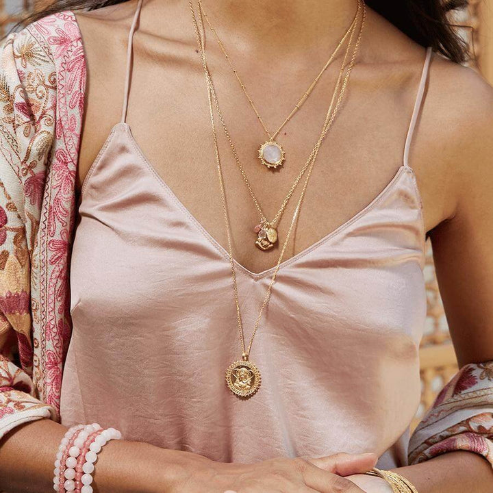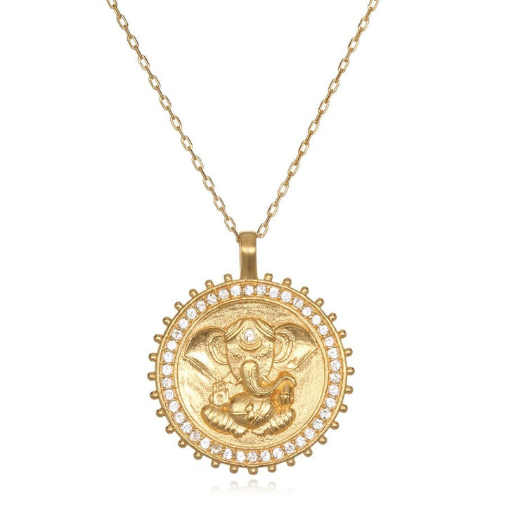 Satya Scainetti has been crafting inspiring jewelry designed for life's journey since 2002. Featuring sacred symbols and healing gemstones, each creation is infused with spiritual meaning to evoke empowerment and joy. Designed with intention in New York City, the jewelry is handcrafted with love in India, Thailand, and the USA, upholding the highest quality standards, ethical practices and social responsibility. Join the brand in supporting children through the Satya Foundation partnership.Style notes: Your path has been cleared; your journey to success has begun. Ganesha, bestower of success and remover of obstacles, sits in the middle of this 18k gold plated pendant, surrounded by glimmering white topaz stone of individuality, creativity and awareness for a longer necklace to inspire your creative endeavors.Price: Please note price may vary due to exchange rate differences or shipping, duties and taxes. Price may also vary with materials choice. Final price is calculated at checkout at the designer's website. Materials: 18k gold plated brass with white topaz.Dimensions: Pendant size - 25mm. Necklace length - 30'.
