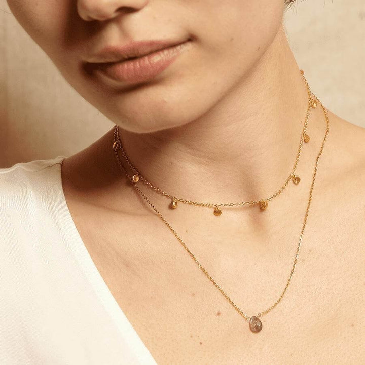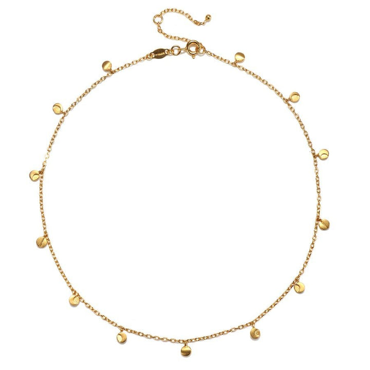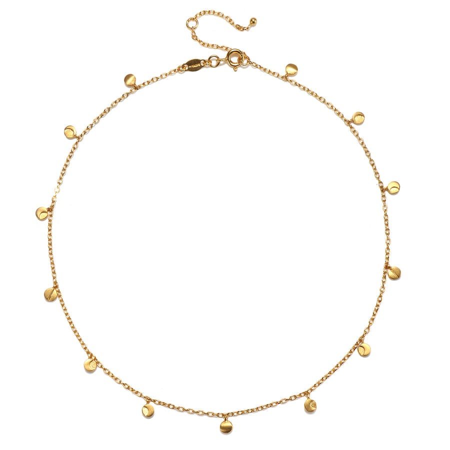 Satya Scainetti has been crafting inspiring jewelry designed for life's journey since 2002. Featuring sacred symbols and healing gemstones, each creation is infused with spiritual meaning to evoke empowerment and joy. Designed with intention in New York City, the jewelry is handcrafted with love in India, Thailand, and the USA, upholding the highest quality standards, ethical practices and social responsibility. Join the brand in supporting children through the Satya Foundation partnership.Style notes: As the goddess moon guides the tides to ebb and flow, we are reminded of when to nurture and when to let go. Delicate moon charms dangle from this 18kt gold plate choker necklace, reflecting the phases of the moon - a celebration of feminine energy and growth.Price: Please note price may vary due to exchange rate differences or shipping, duties and taxes. Price may also vary with materials choice. Final price is calculated at checkout at the designer's website. Materials: 18k gold plated brass. Dimensions: Pendant size - 4mm round. Necklace length - 14'' with 3'' extension chain.
