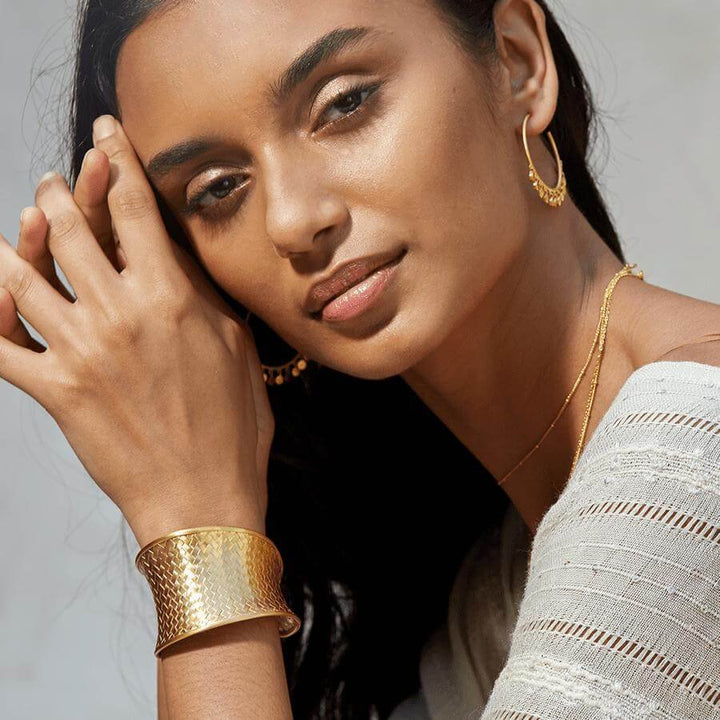 Satya Scainetti has been crafting inspiring jewelry designed for life's journey since 2002. Featuring sacred symbols and healing gemstones, each creation is infused with spiritual meaning to evoke empowerment and joy. Designed with intention in New York City, the jewelry is handcrafted with love in India, Thailand, and the USA, upholding the highest quality standards, ethical practices and social responsibility. Join the brand in supporting children through the Satya Foundation partnership.Style notes: A subtle statement piece, this cuff is intricately woven, making it perfect for anyone looking to add a dash of glamour to their outfit.Price: Please note price may vary due to exchange rate differences or shipping, duties and taxes. Price may also vary with materials choice. Final price is calculated at checkout at the designer's website. Materials: 18k gold plated brass. Dimensions: Bracelet size - 1.75' wide with 2.5' diameter, adjustable.