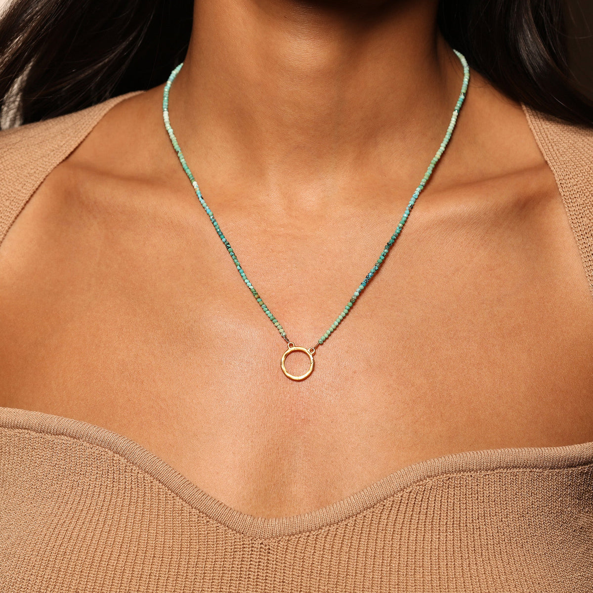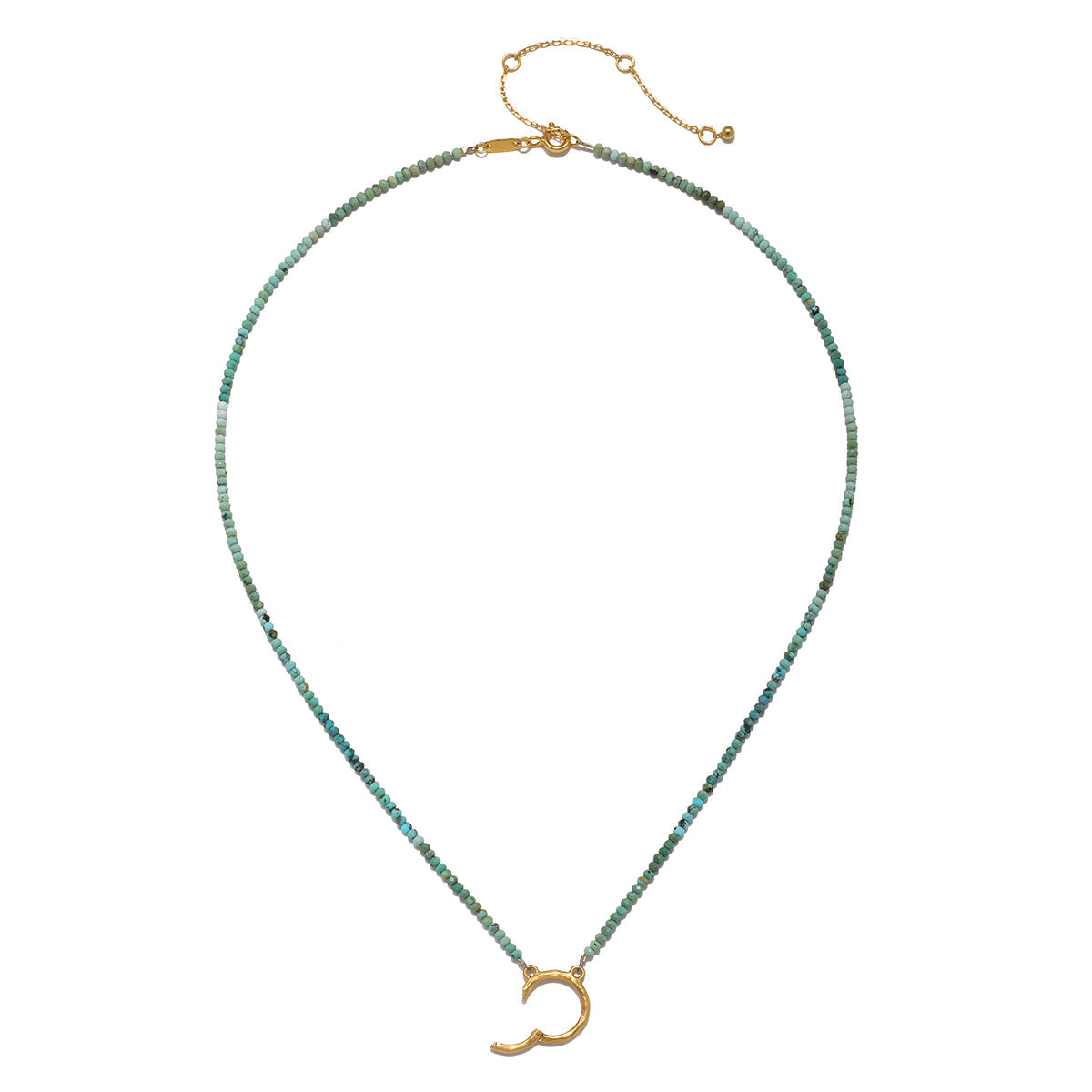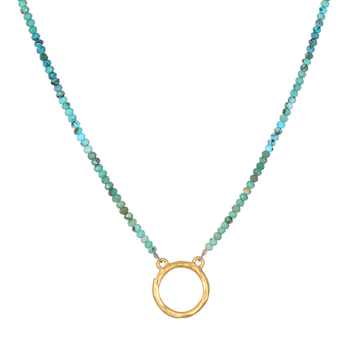 This necklace features 2.5mm faceted rondelle shaded turquoise beads, known for promoting health, intuition, and self-expression. The charm holder, made of 18kt gold-plated brass, measures 14.5mm in diameter. The necklace offers a 16' length with a 3' extension for adjustable wear.