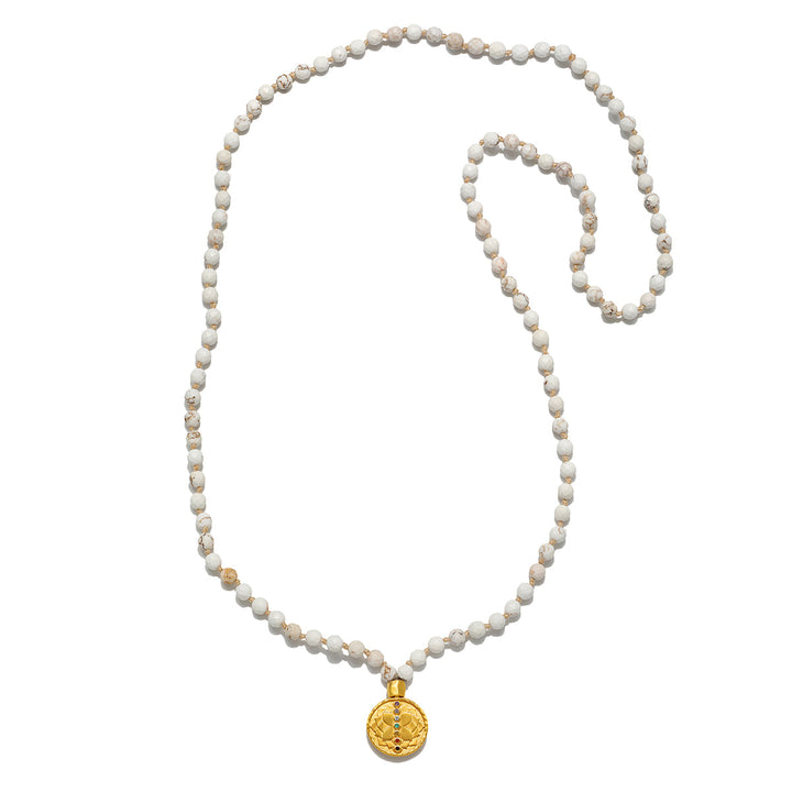 Align your intentions with this 108-bead white turquoise mala, encouraging health and self-expression. Anchored by a lotus pendant and featuring gemstones representing the seven chakras, this mala supports meditation and manifestation.