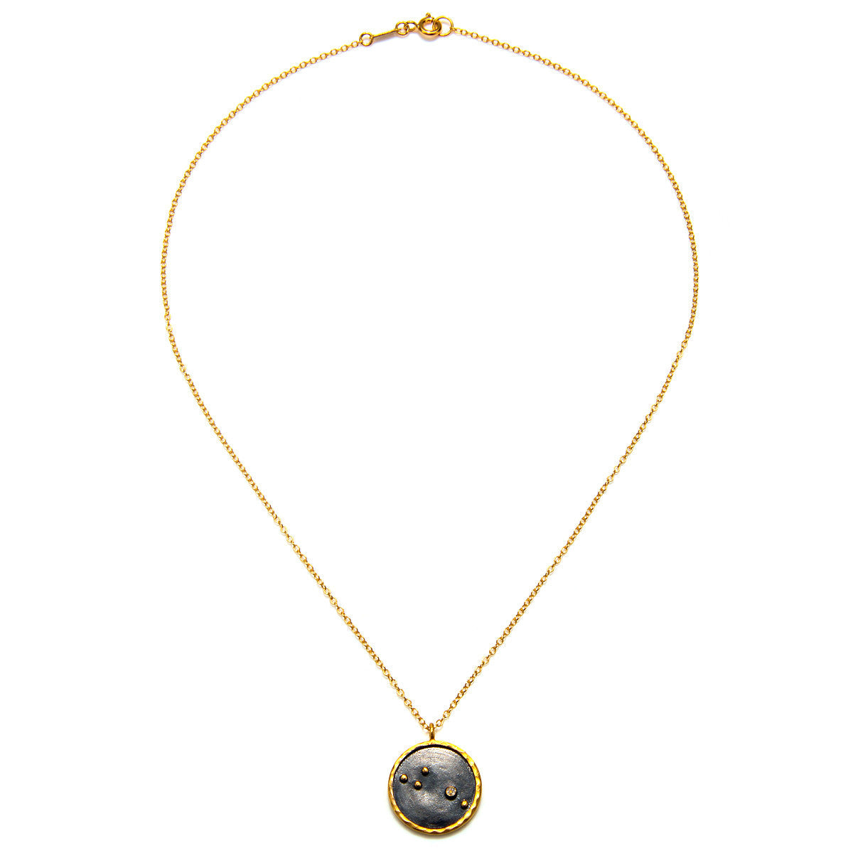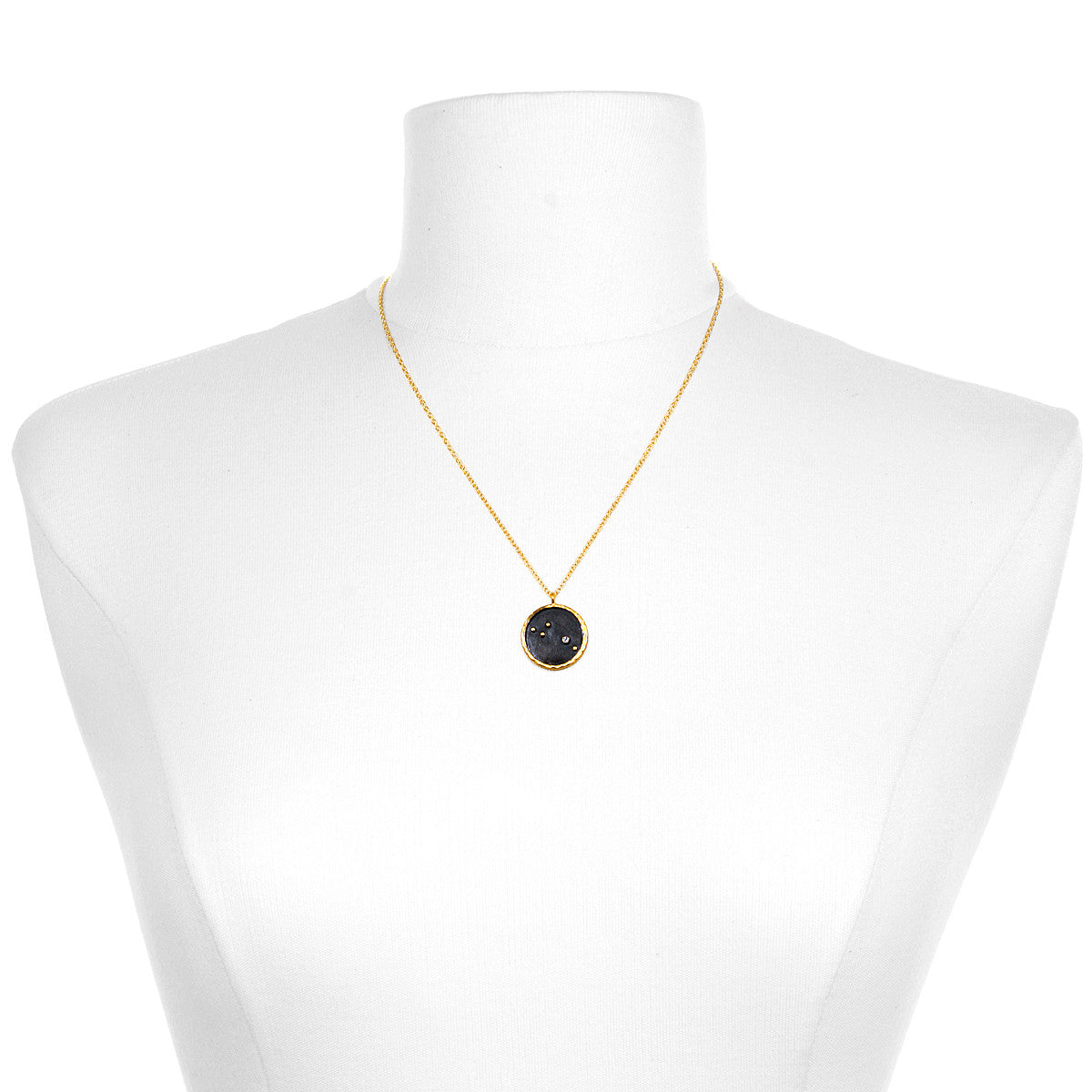 Pendant diameter: 0.8", Necklace length: 18", 18kt gold plate and gunmetal over brass