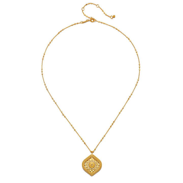 Awaken your awareness to the beauty around you with this eye-catching lotus petal medallion necklace. Accented with white topaz, it symbolizes new beginnings and infinite potential.