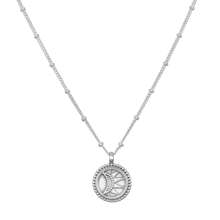 Under a burnished sky, this sterling silver pendant necklace features a sunburst peeking out from behind a crescent moon, symbolizing vitality and goddess energy.