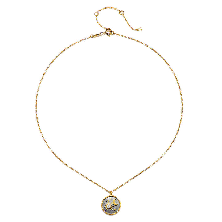 Pendant size: 16mm, Necklace length: 16' + 3' extension chain, 18kt gold plate and gunmetal over brass