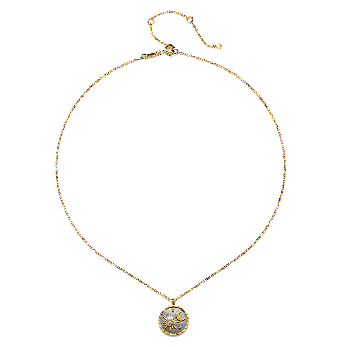 A celestial night sky pendant with a pearl accent, June’s birthstone, symbolizes innocence, beauty, and foresight. This necklace is finished with a gold star extender.