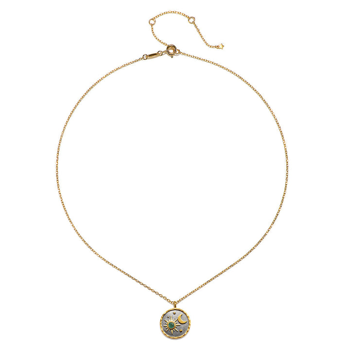 May’s birthstone, emerald, symbolizes wisdom, abundance, and mercy in this celestial pendant necklace, set against a night sky with a gold star extender.