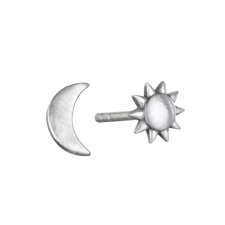 Sterling silver sun and moon stud earrings capture the vitality of the sun and the nourishing energy of the moon, perfect for daily wear or layering up the ear.