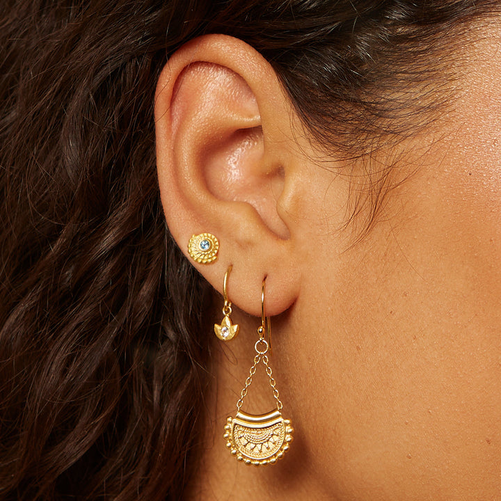 These blue topaz stud earrings, inspired by the mandala, represent wisdom, communication, and love. The intricate beading and the vivid blue stone make them a beautiful addition to any ear stack or a statement on their own. A perfect choice for someone seeking to channel vitality and leadership through their jewelry.