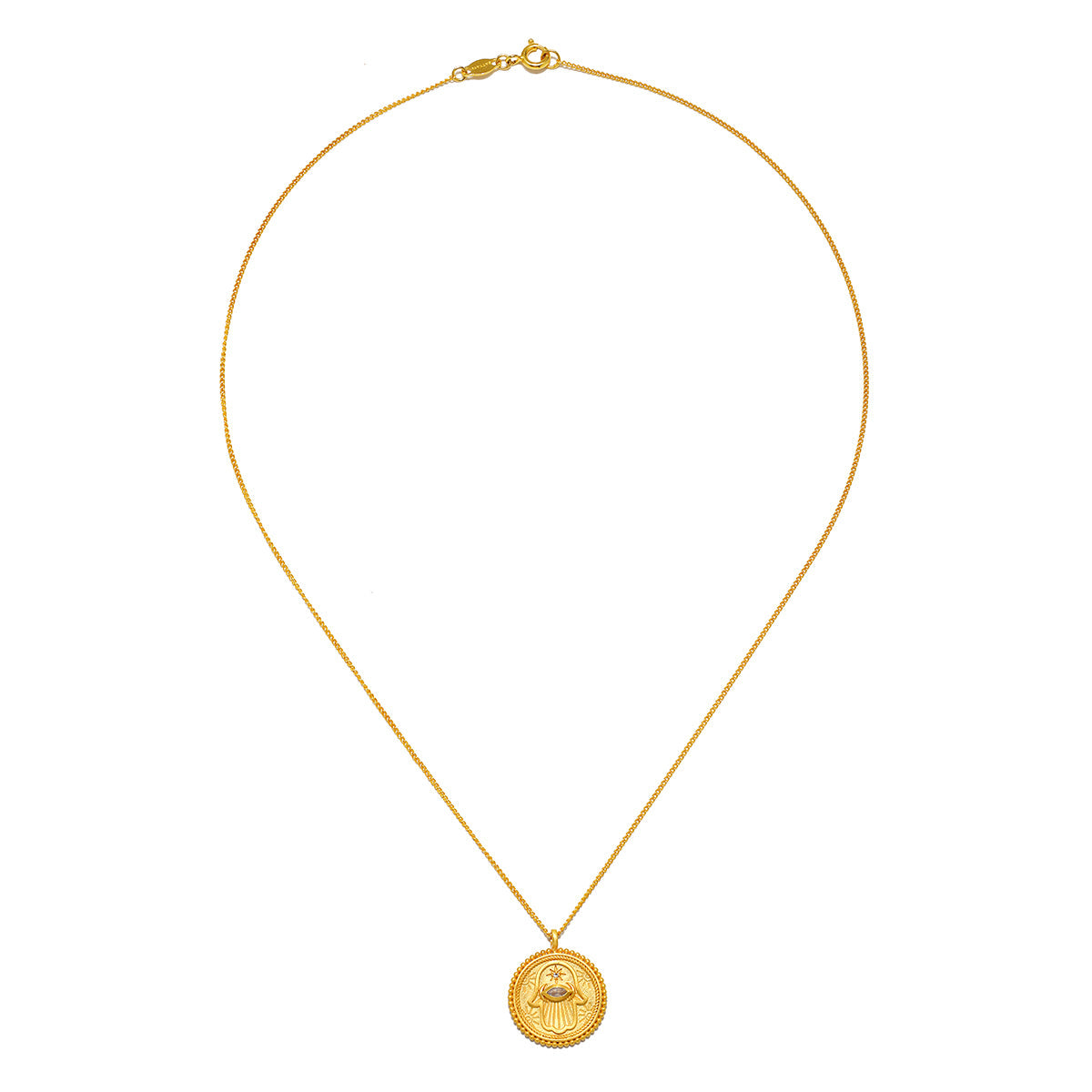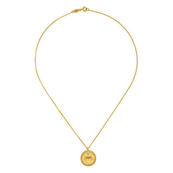 The cradled in positivity hamsa necklace symbolizes protection and blessings, with a shimmering moonstone at its center. The mantra 'I Am Protected' inscribed on the back adds a spiritual touch, making this necklace perfect for those seeking intuition, passion, and good fortune in their journey.