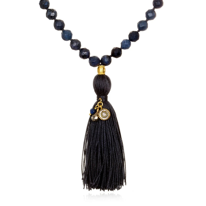 The dumortierite sun mala necklace is inspired by the endless beauty of the sky. Meditate on the vitality of the sun and the positivity and clarity offered by the dumortierite and pyrite beads. This mala is perfect for grounding meditation or as a stylish, meaningful accessory.