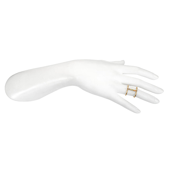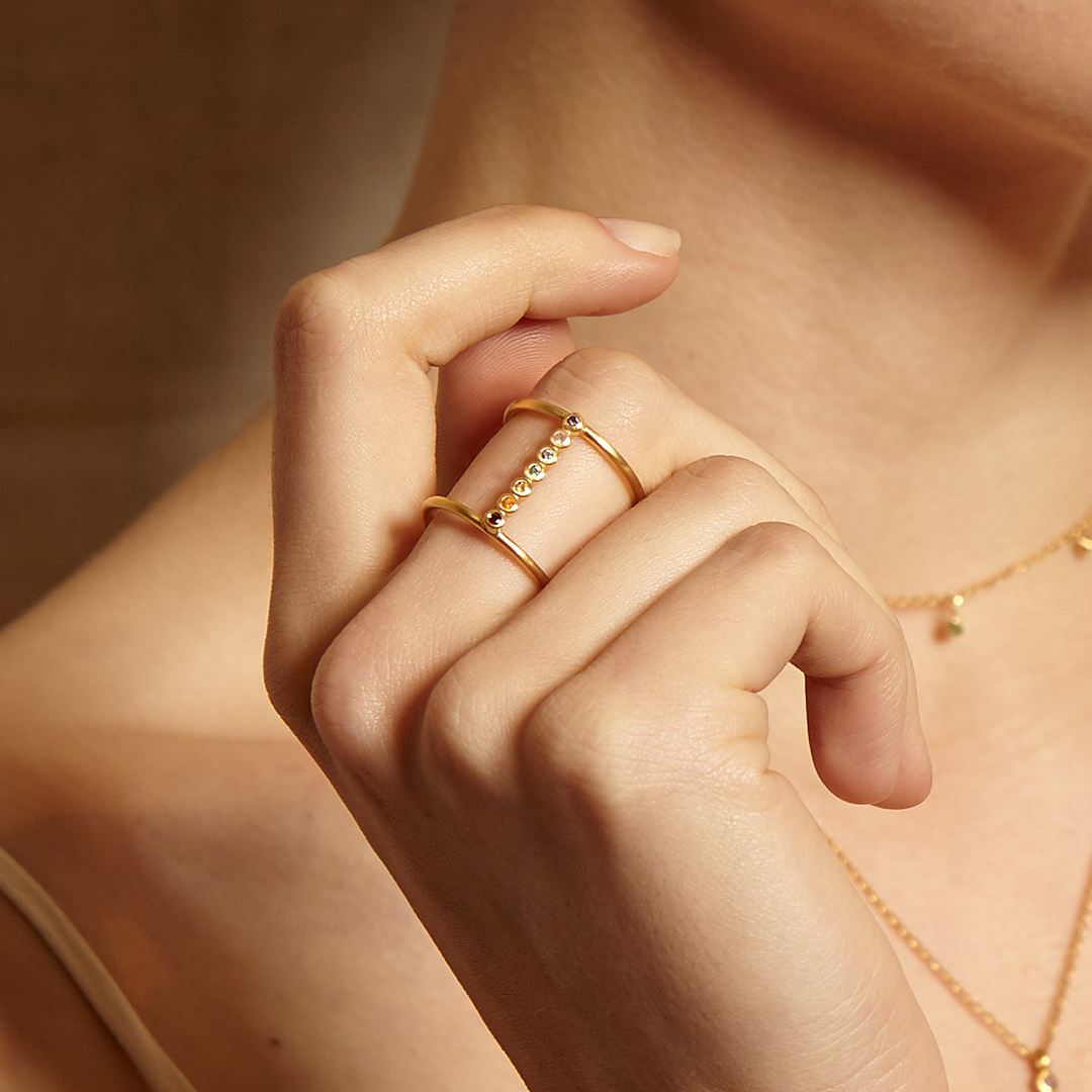 Adjustable ring. Crafted from 18kt gold plate over brass, featuring amethyst, blue agate, blue topaz, green onyx, citrine, carnelian, and red garnet stones.