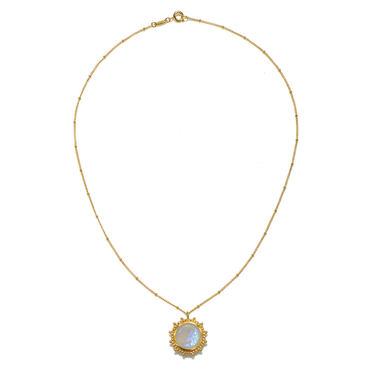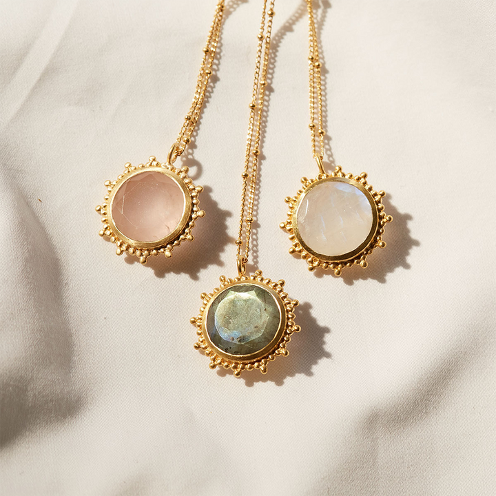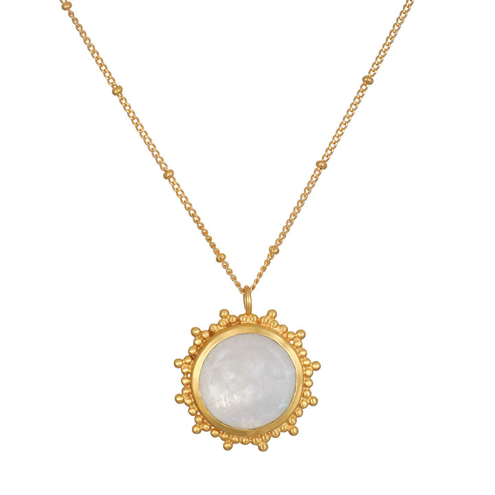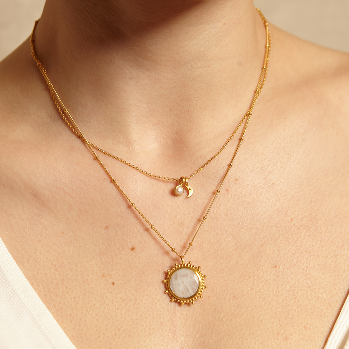 The drift into daydreams necklace encourages the wearer to embrace their creativity through daydreams. The moonstone pendant, symbolizing intuition and passion, is framed by a beaded starburst design, making it a standout accessory for those who love celestial-inspired jewelry.