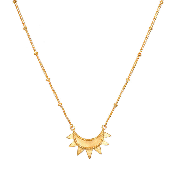 The emergence gold sunburst necklace shines with vitality and leadership, symbolized by the delicately beaded sunburst pendant. This 18kt gold plated necklace is perfect for those who seek to radiate joy and strength in their everyday style.