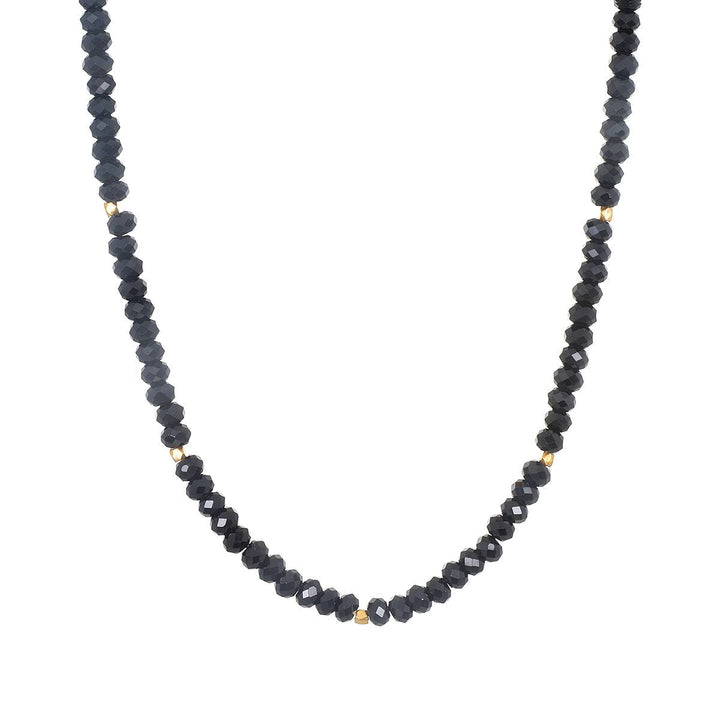 Stone size: 5mm faceted black spinel. Necklace length: 14 inches + 3-inch extension chain. Crafted from 18kt gold plate over brass.