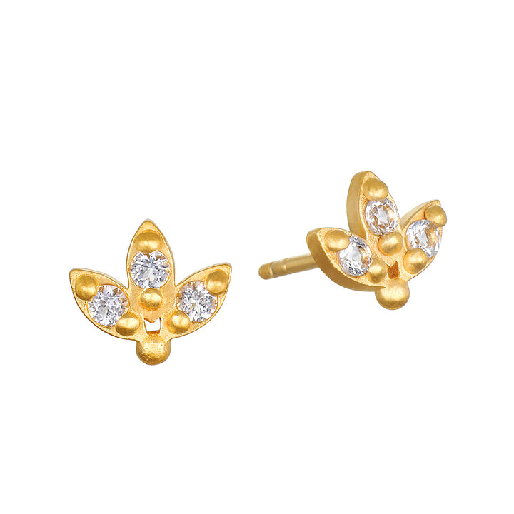 The empowering transformation white topaz lotus stud earrings feature the iconic lotus flower, a symbol of new beginnings, paired with sparkling white topaz stones that represent individuality and creativity. These 18kt gold plated earrings are perfect for daily wear or for adding a personal touch to an ear stack.