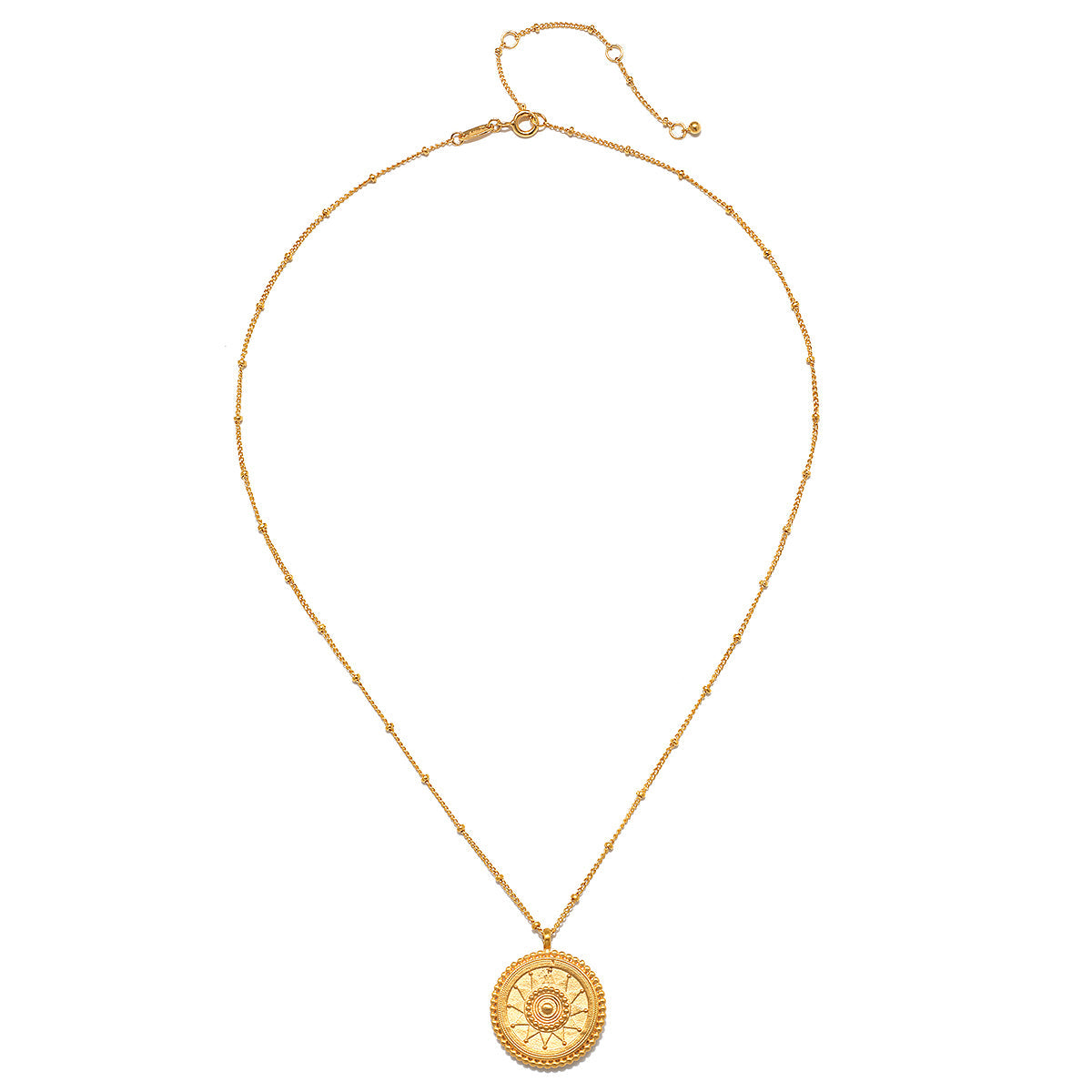 The first light gold medallion necklace reminds you of the infinite possibilities that dawn brings. This reversible necklace features a brilliant sun on one side and a sunburst with white topaz stars on the other, symbolizing vitality, leadership, and dreams.