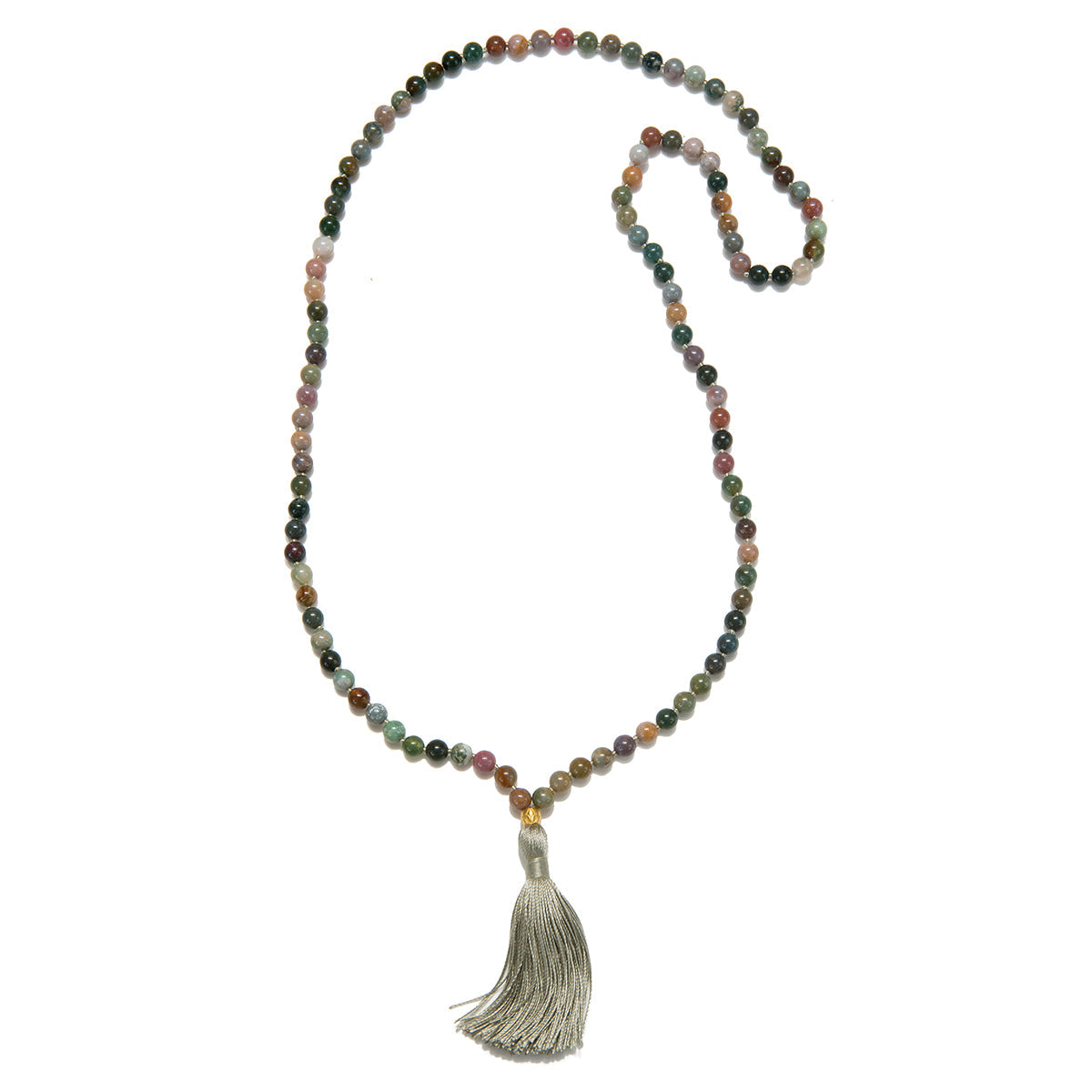 Root yourself in peace and light with this grounding mala. Featuring 108 fancy jasper beads and a lotus-engraved gold bead, it’s anchored by a hand-tied silk tassel for a meaningful touch.