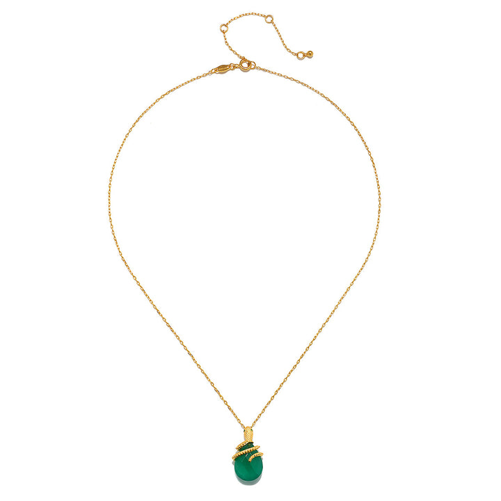 This necklace features a teardrop of green onyx cradled by a gleaming serpent, symbolizing energy and immortality. The green onyx promotes grounding and guidance, making it a serene addition to any collection.