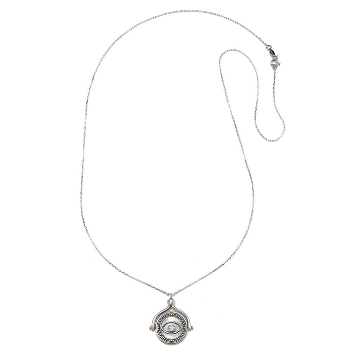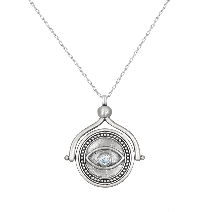 This sterling silver spinner necklace features an evil eye on one side and a hamsa on the other, offering protection and blessings. A white topaz adds sparkle, making it a meaningful piece for protection and intuition.
