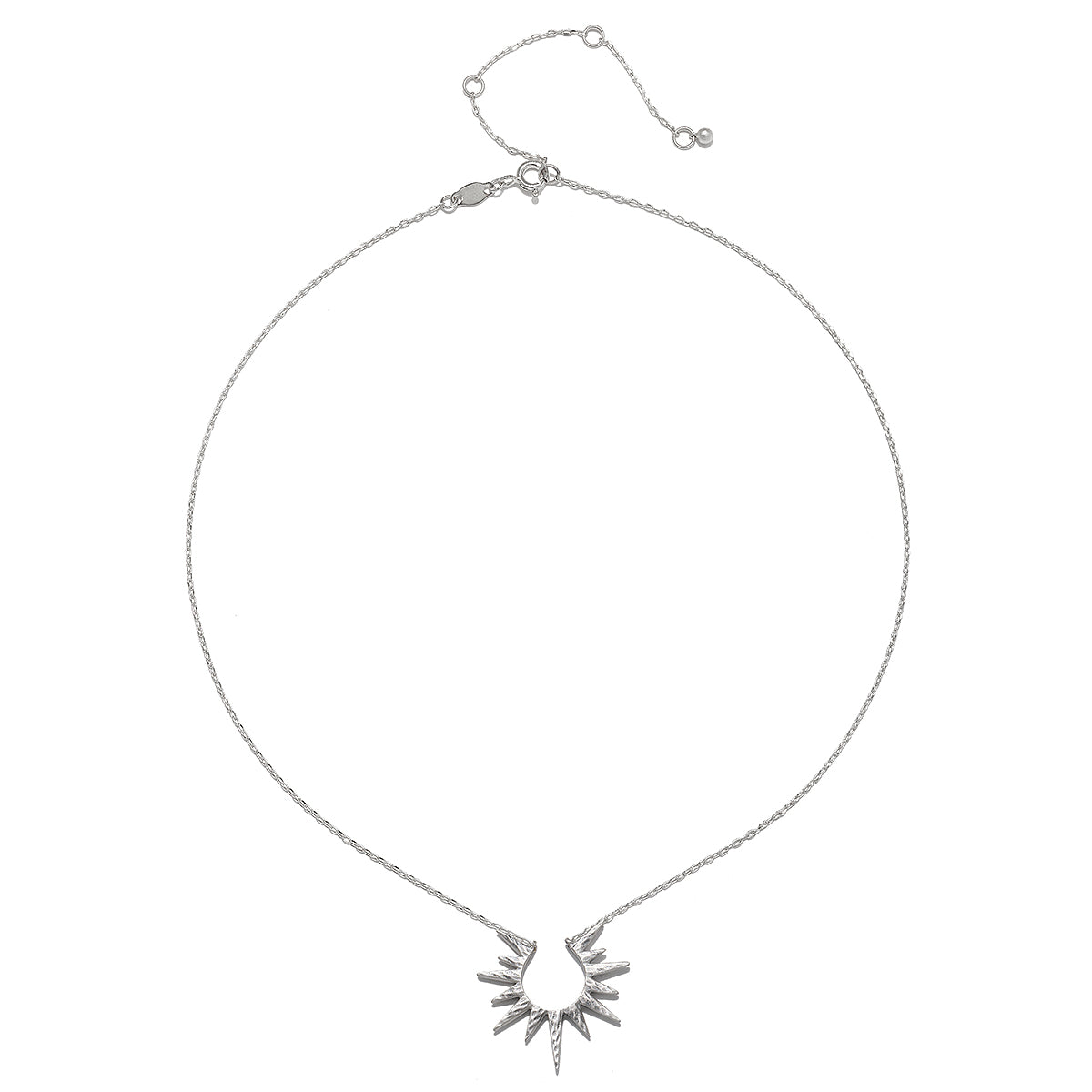A sterling silver necklace with an open-work starburst pendant, symbolizing dreams and inspiration. The brilliant design creates a timeless piece that guides and inspires the wearer.