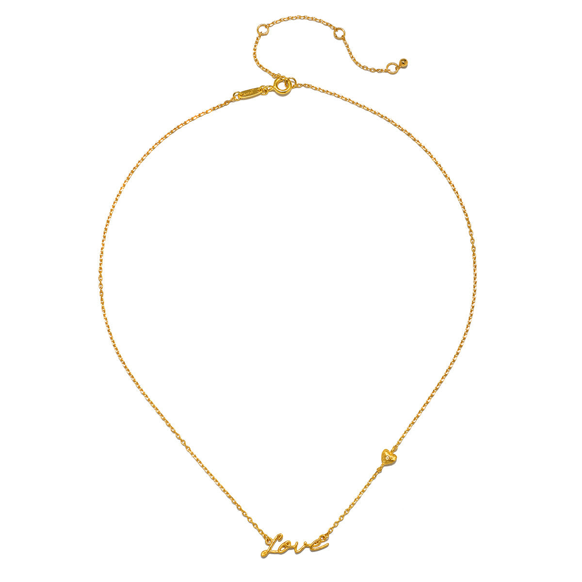 18kt gold plate over brass, tourmaline stone size 3mm, Love pendant size 21 x 6.5mm, heart pendant size 5mm, necklace lengths: 14' + 3' extension, 16' + 3' extension.
