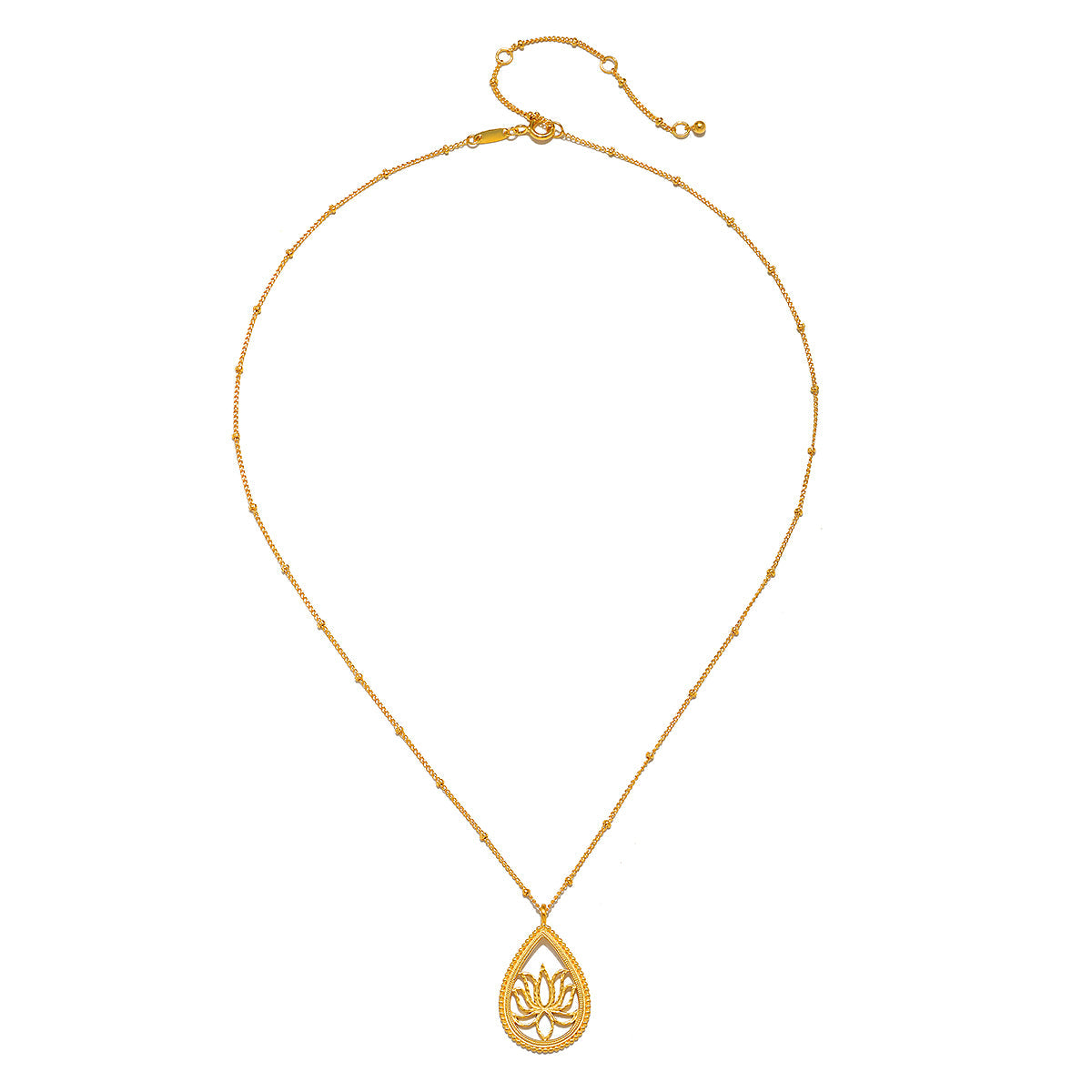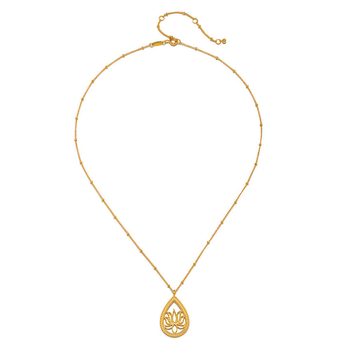 18kt gold plate over brass, crescent pendant size 10 x 18mm, teardrop lotus pendant size 26 x 19mm, necklace lengths: 16' + 3' extension and 18' + 3' extension.