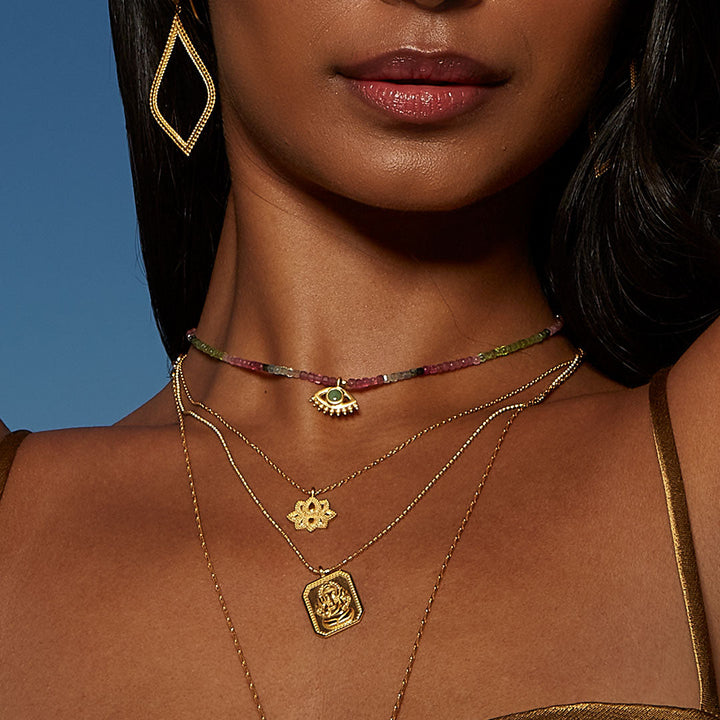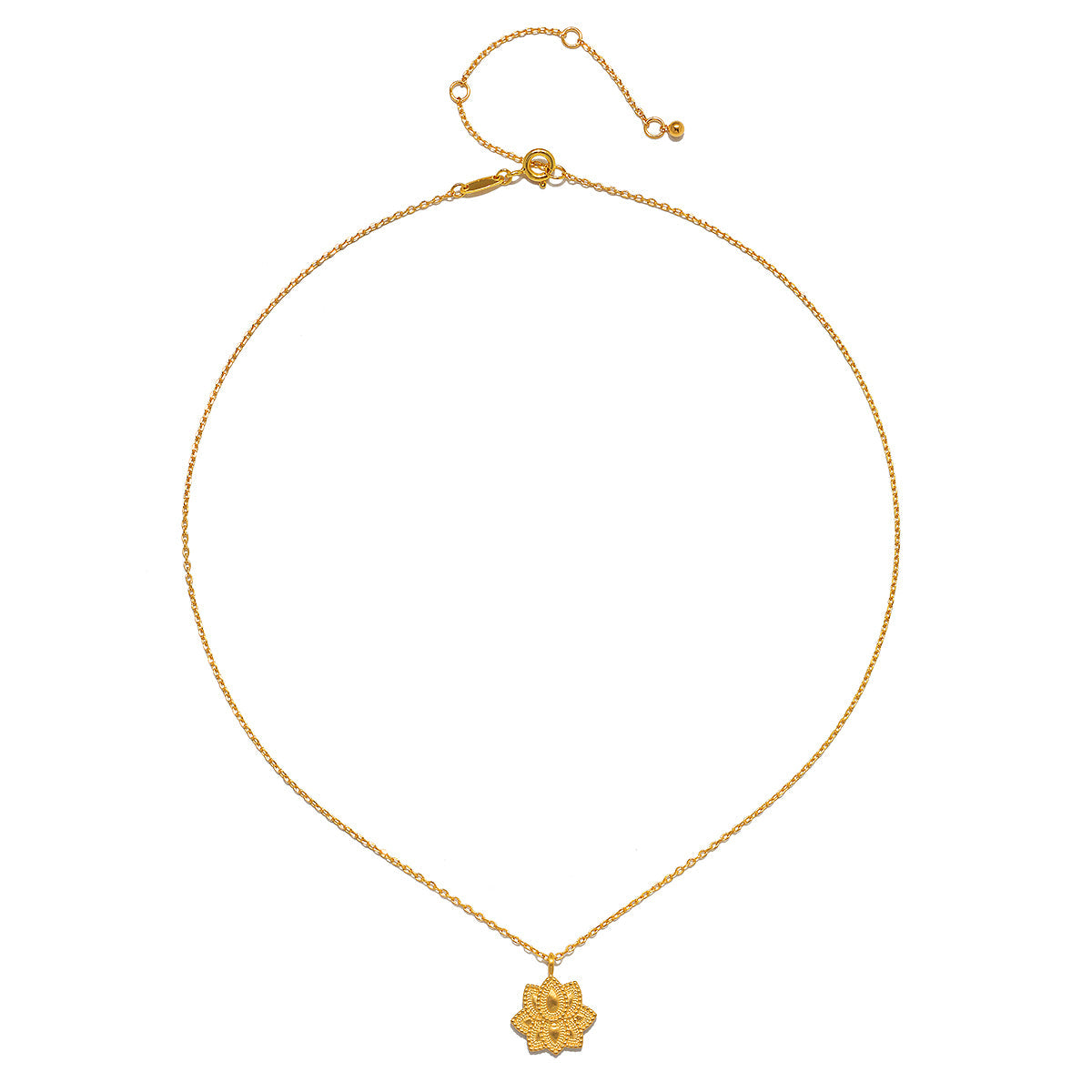 The Journey Forward Lotus Gold Necklace features a detailed lotus pendant with delicate beading along the petals, symbolizing new beginnings and full potential. This 18kt gold plated piece celebrates the beauty of the lotus flower, making it perfect for everyday wear or as a reminder of growth.