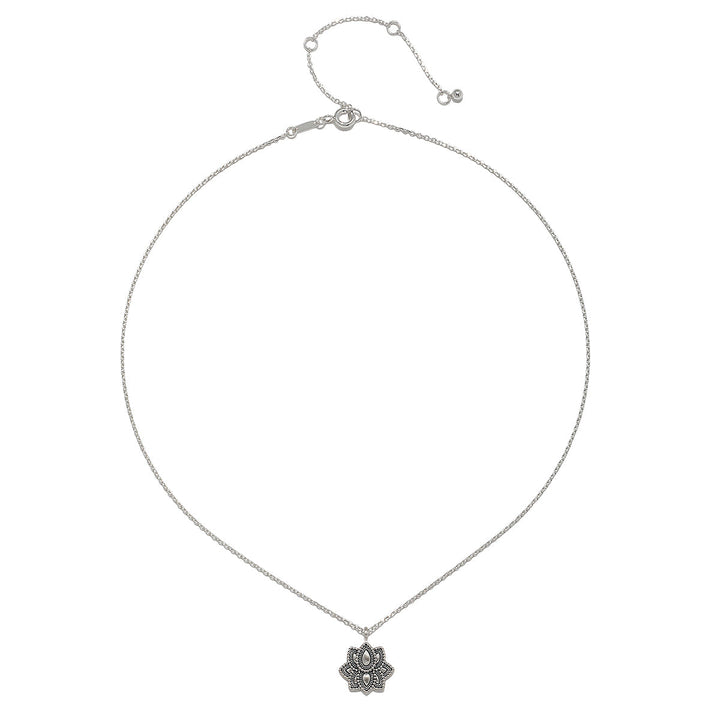 The Journey Forward Lotus Silver Necklace mirrors its gold counterpart, but in gleaming 925 sterling silver. The lotus flower pendant symbolizes new beginnings, intricately detailed with beaded edges, representing infinite potential and growth.