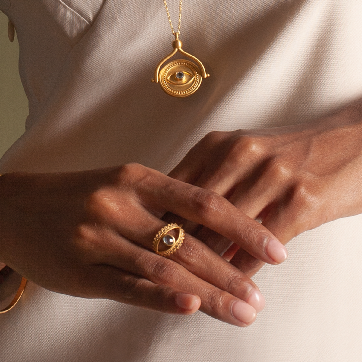 Shield yourself from negativity with this stunning gold-plated ring, featuring an evil eye design that symbolizes intuition and protection. The gleaming blue topaz brings wisdom and communication to the wearer, making this piece both meaningful and stylish.