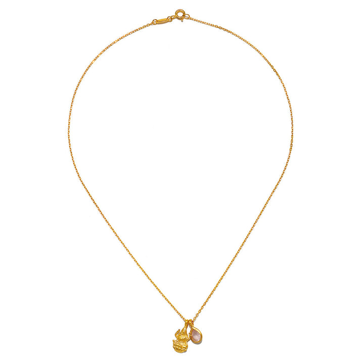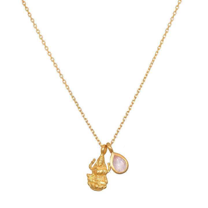 Love is infinite, like the soft glow of starlight. This 18KT gold-plated necklace features Lakshmi, the Hindu Goddess of prosperity and abundance, alongside a teardrop-shaped rose quartz stone. Rose quartz, known for its association with self-love and compassion, makes this necklace a symbol of both love and abundance. Wear it as a reminder of the light and love within.