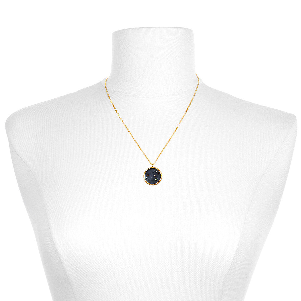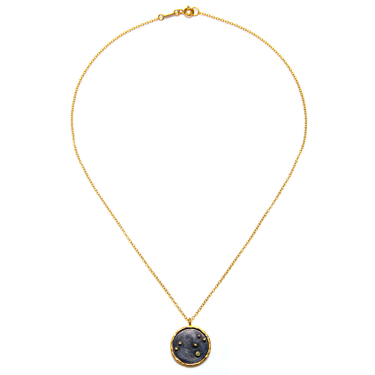 18KT gold plate and gunmetal over brass. Necklace length: 18''. Pendant diameter: 0.8''.