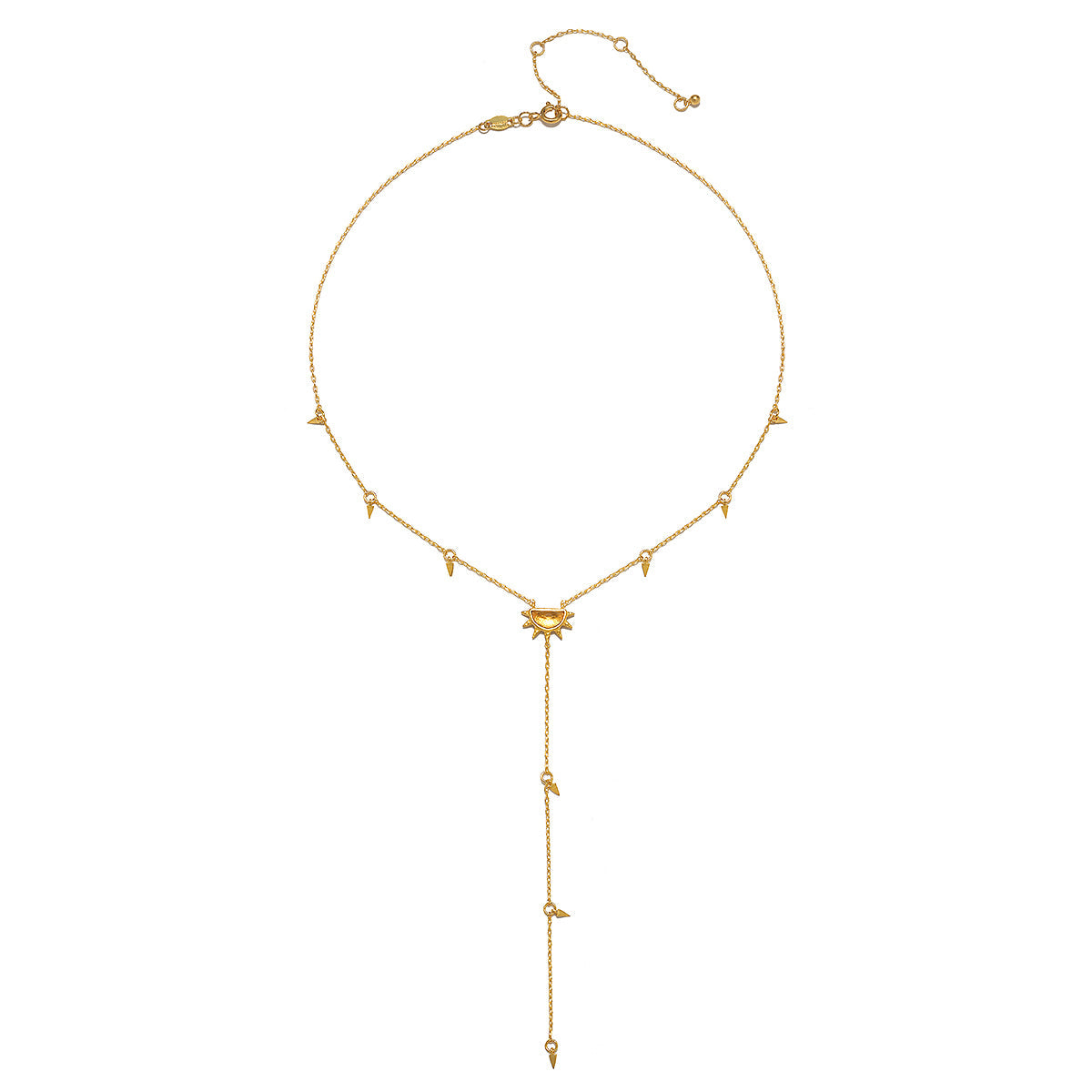 This lariat necklace shines with a brilliant sunburst and citrine, representing vitality and radiance. The empowering design symbolizes the return of light after darkness, making it a perfect piece to ignite joy and inspiration.