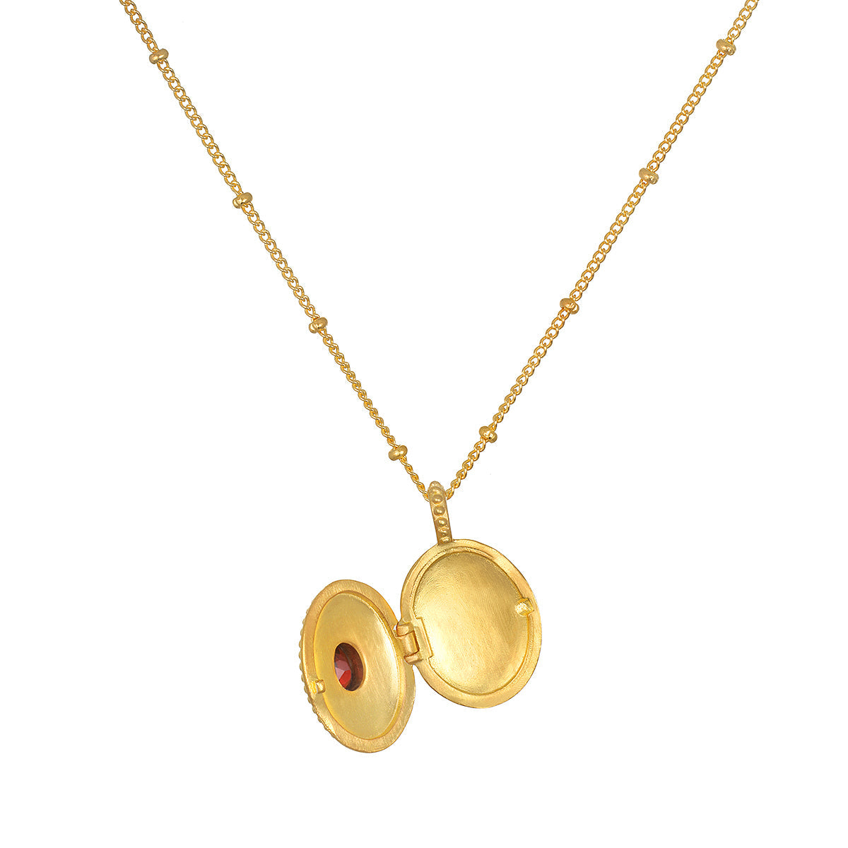 This elegant 18kt gold plated locket necklace showcases engraved lotus flowers, representing new beginnings and full potential. Sparkling with a faceted red garnet, January's birthstone, this piece is ideal for creating a personal keepsake while celebrating your birth month.
