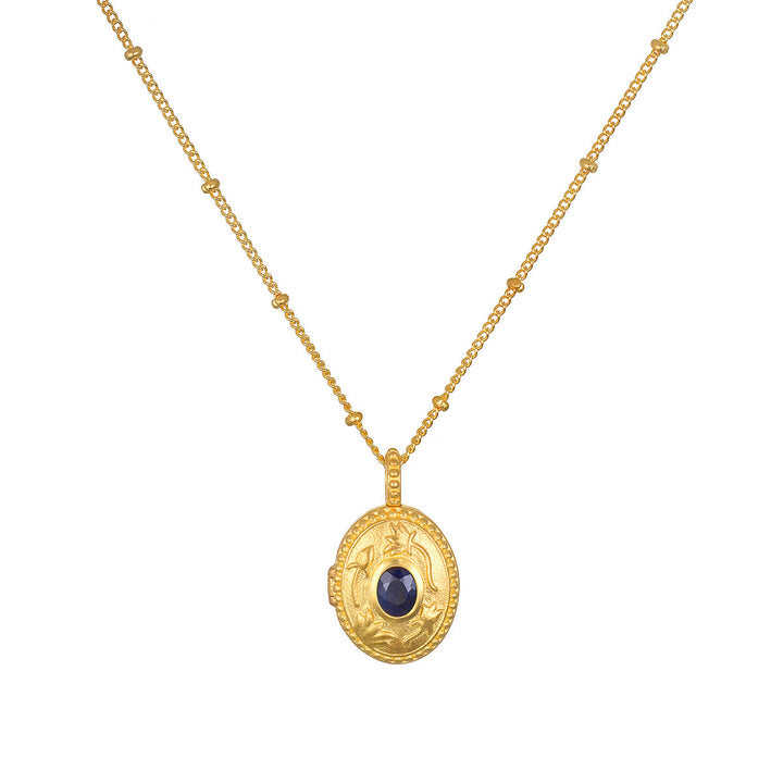 This elegant 18kt gold plated locket necklace features engraved lotus flowers, symbolizing new beginnings and full potential. The sparkling sapphire, September's birthstone, enhances its beauty, making it a cherished keepsake for celebrating your birth month.